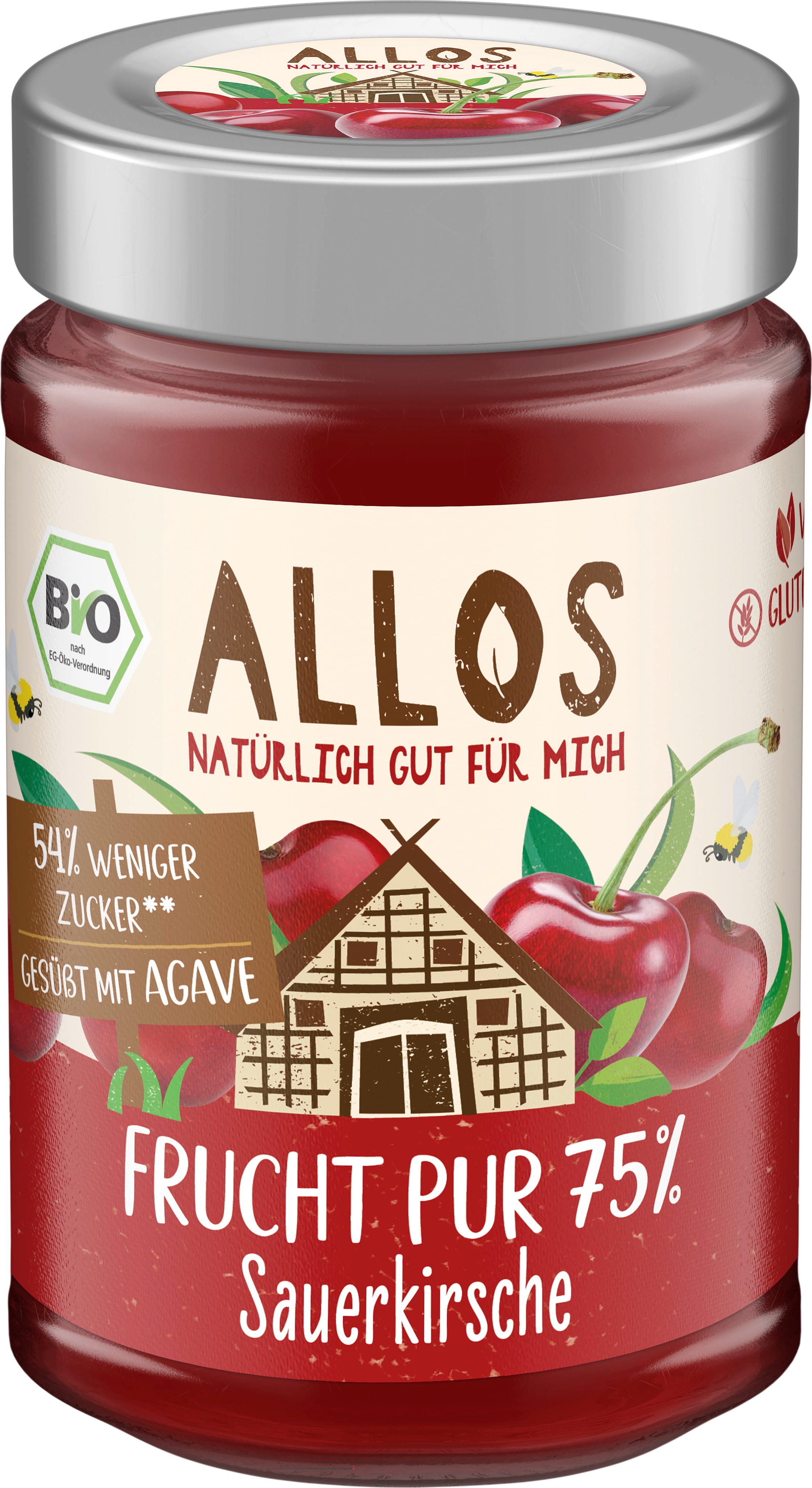 Tiszta gyümölcsíz a reggeli kenyérre: az ALLOS ezt most lehetővé teszi 75%-os bio gyümölcskrémével. Ehhez a változathoz a meggyet kíméletesen dolgozzák fel, és az agávészirup édességével egészítik ki. Az enyhe savasság és természetes édesség ideális kombinációja. Vegán és 54%-kal kevesebb cukrot tartalmaz.