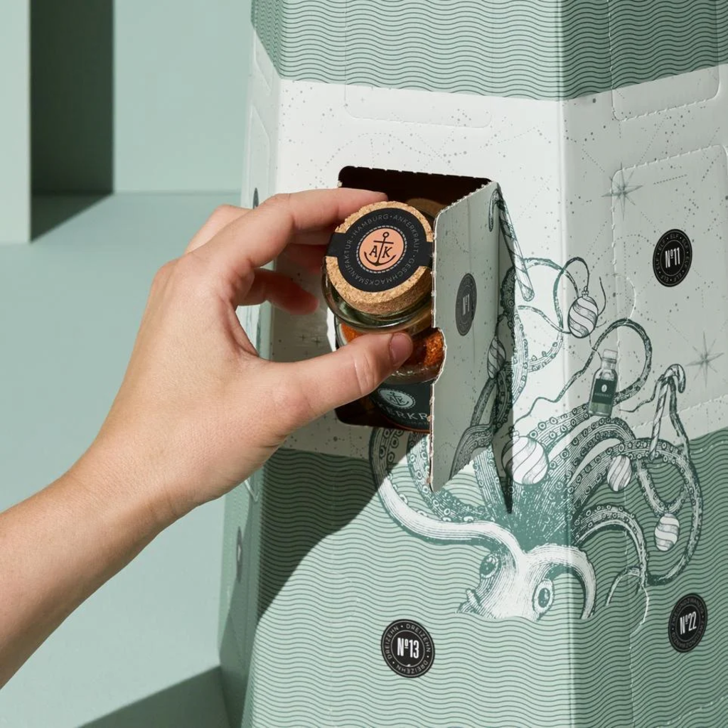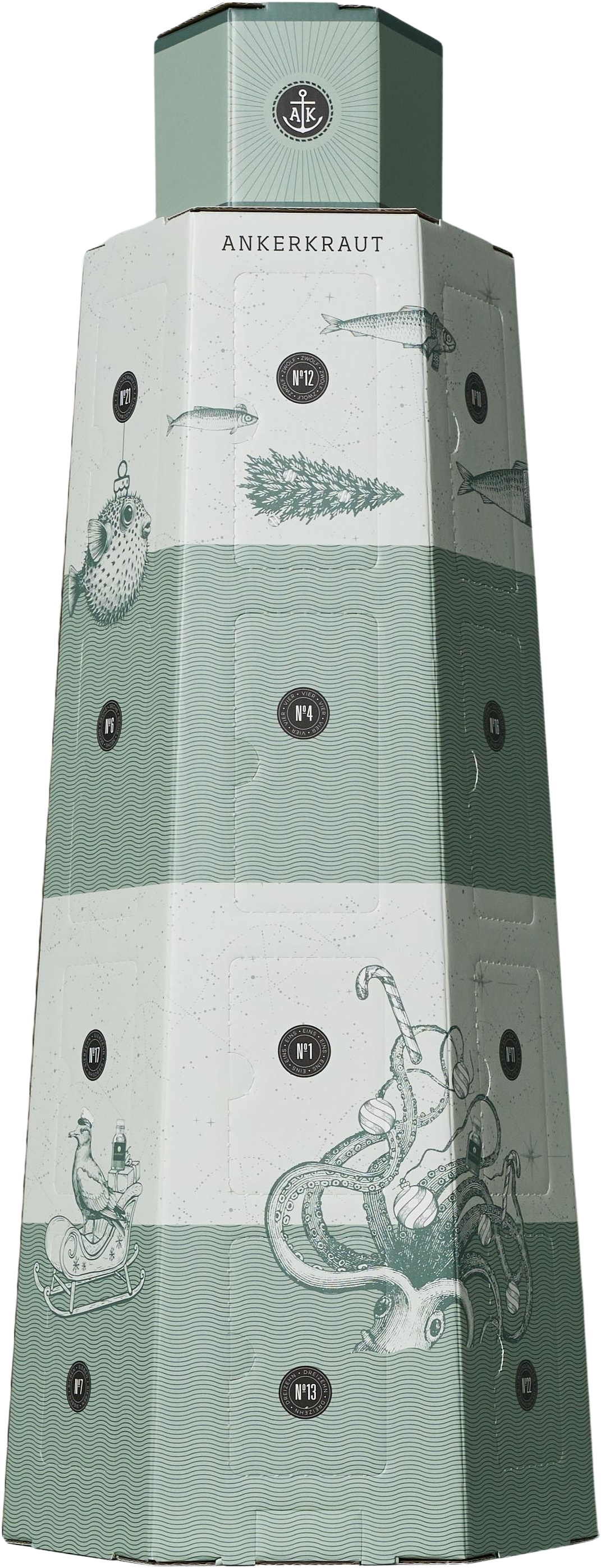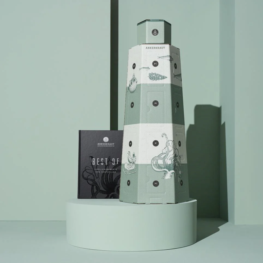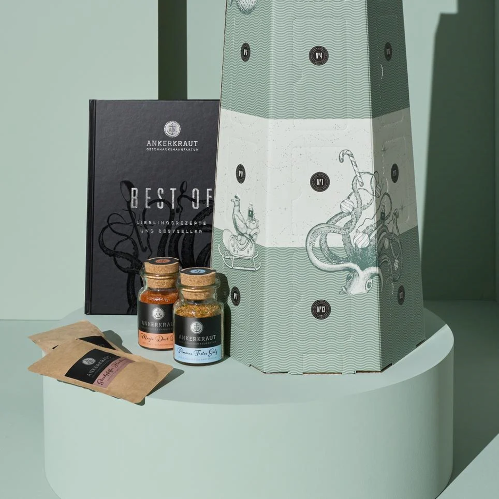 Leuchttum dizájnnal csomagolva, ez az adventi naptár északnémet hangulatot áraszt, és lerövidíti a karácsonyig tartó várakozást. Az ANKERKRAUT 24 kedvenc termékét tartalmazza elegáns parafás üvegekben és praktikus utántöltő tasakokban. Exkluzív extraként egy (német nyelvű) szakácskönyvet is tartalmaz, tele hozzá illő receptekkel.