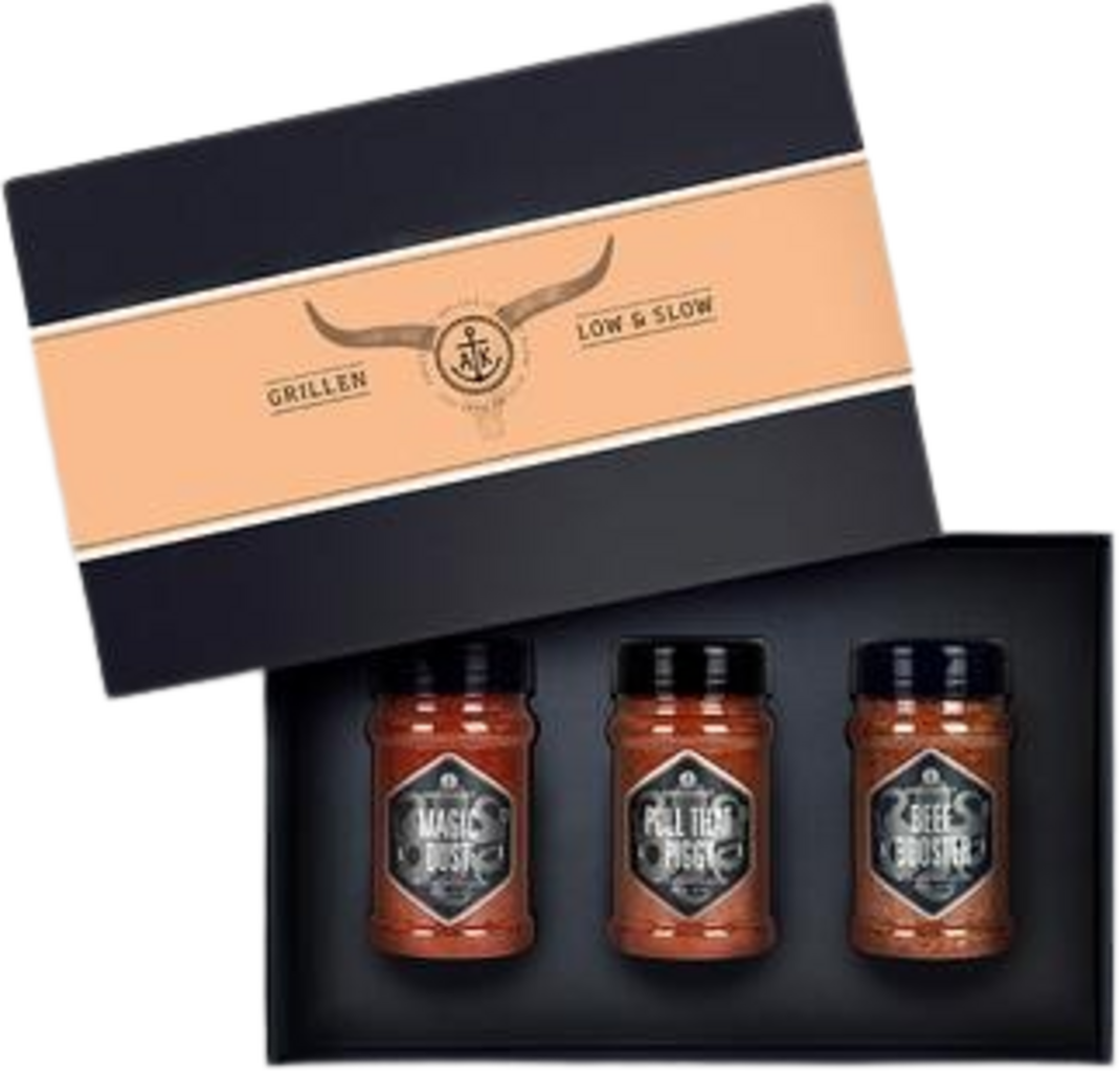BBQ grillmesterek számára: az Ankerkraut által gyártott három legjobb szárazpác. Kiváló minőségű kartondobozba csomagolva, elegáns, fekete kivitelben.
