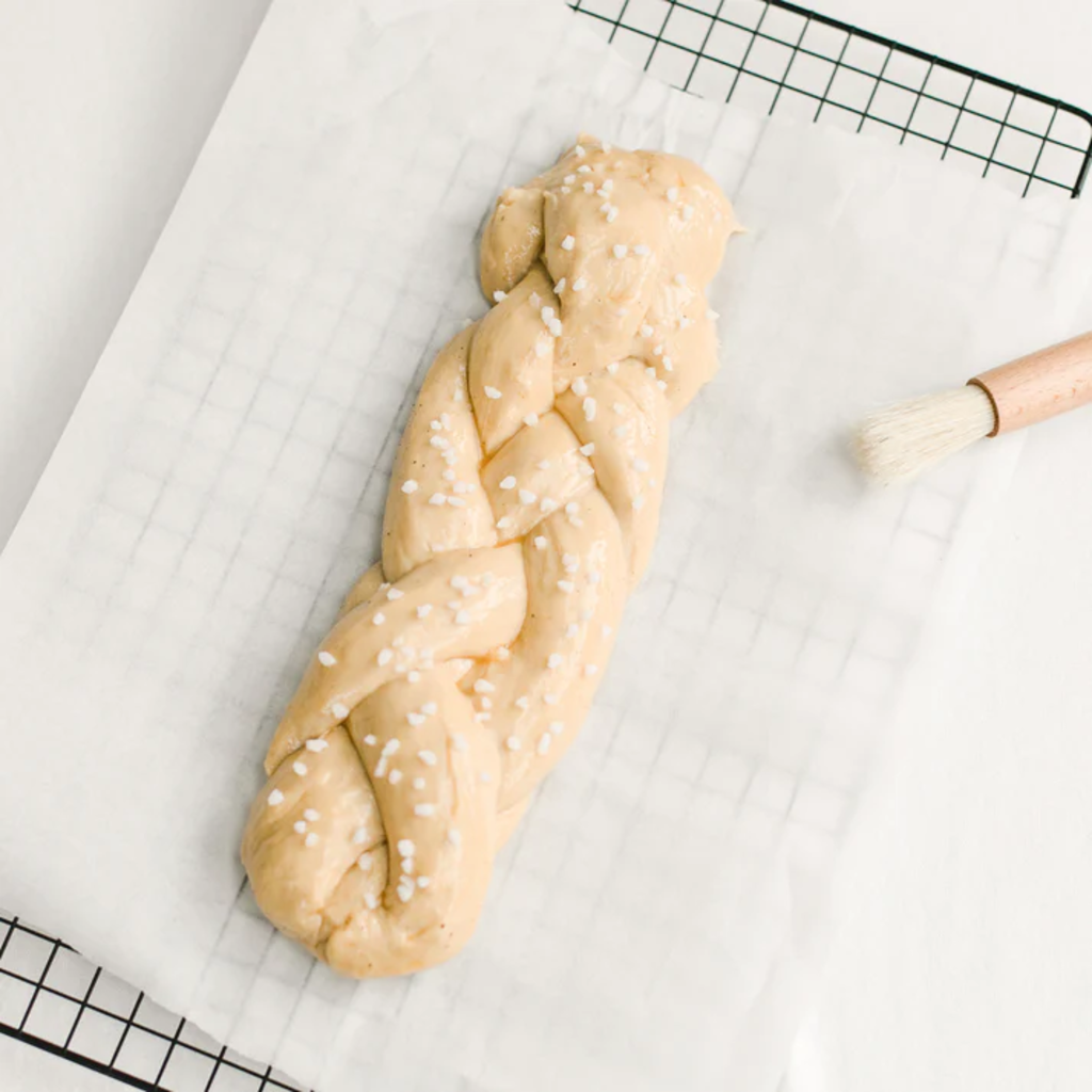 - Formázás után kenje le a kalácsot 1 evőkanál növényi tejjel vagy vízzel, majd fedje le átlátszó fóliával.