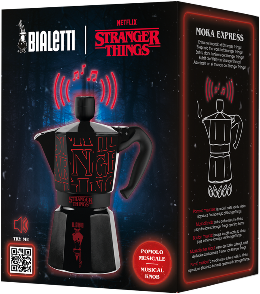 Ez a menő „Stranger Things” megjelenésű eszpresszó főző még többet tud: A fedél gombjába integrált hangszóró a főzési folyamat alatt a Stranger Things filmzenéjét játssza. Abszolút kötelező darab a kultikus sorozat minden rajongója számára, és természetesen csodálatos ajándék is.