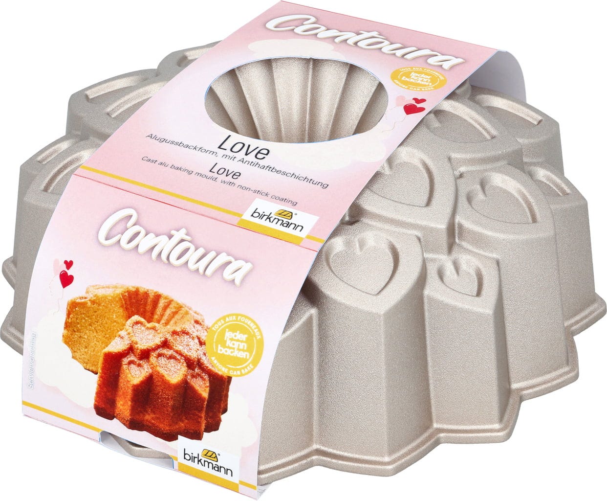 A Birkmann Contoura sorozatának Love kuglóf sütőformája tökéletes választás finom, nemcsak ízletes, de szép sütemények készítéséhez. Részletes szívmotívumaival ez a kiváló minőségű öntött alumínium forma romantikus és elegáns megjelenést kölcsönöz süteményének. Az anyag egyenletes hőeloszlást és tökéletes pirulást biztosít, míg a tapadásmentes bevonat megkönnyíti a sütemény kivételét. Akár 200°C-os hőállóságával a forma praktikus és tartós is. Fejezze ki süteményeivel a szeretetet és a stílust.