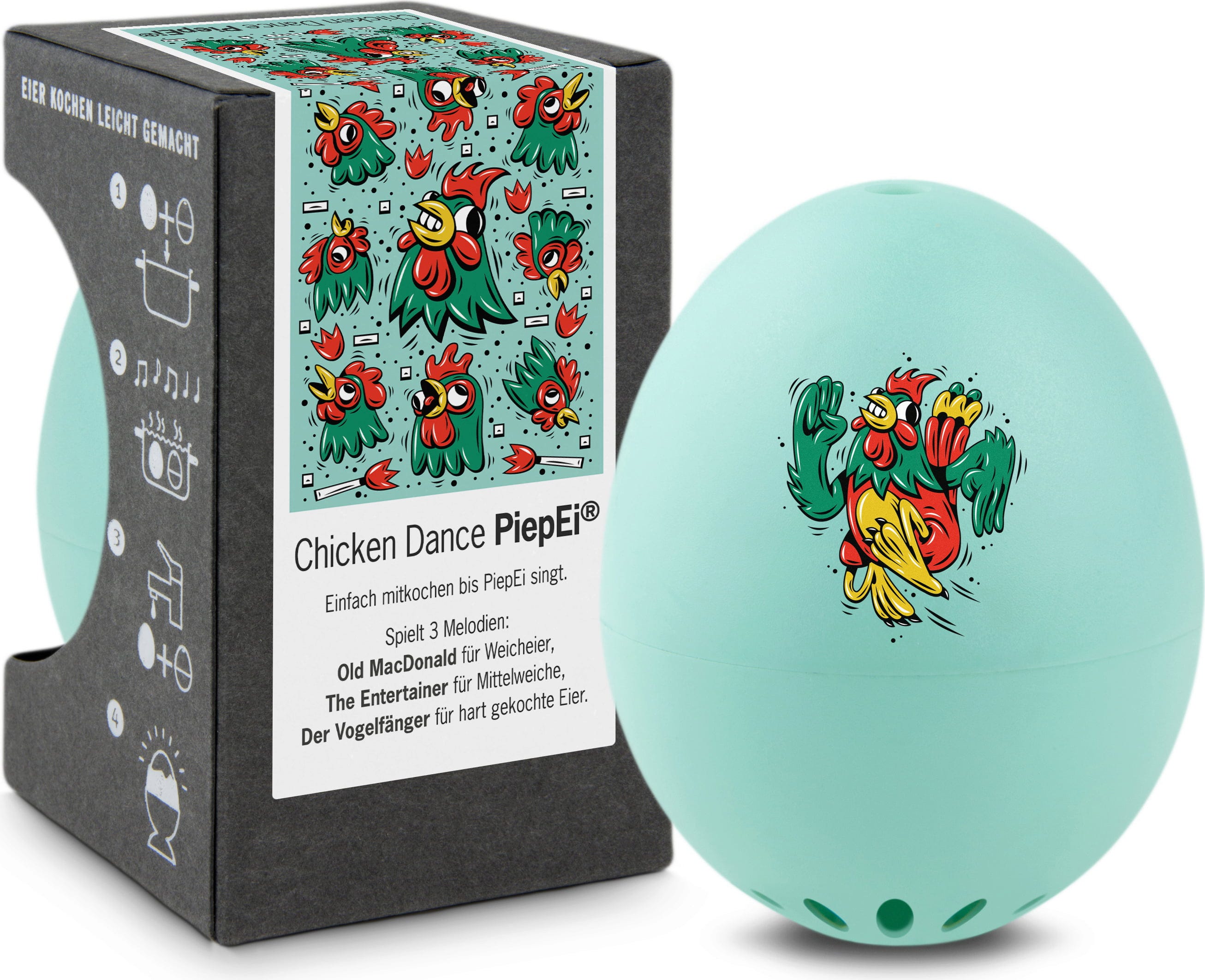 Egyszerűen tárolja a Chicken Dance PiepEi eszközt a tojásokkal együtt, főzze őket közösen, és várjon, amíg a kívánt keménységi fokhoz tartozó dallam megszólal. Függetlenül attól, hogy milyen vízhőmérséklettel kezd, mekkora a tojás mérete, vagy milyen tengerszint feletti magasságon főz.
