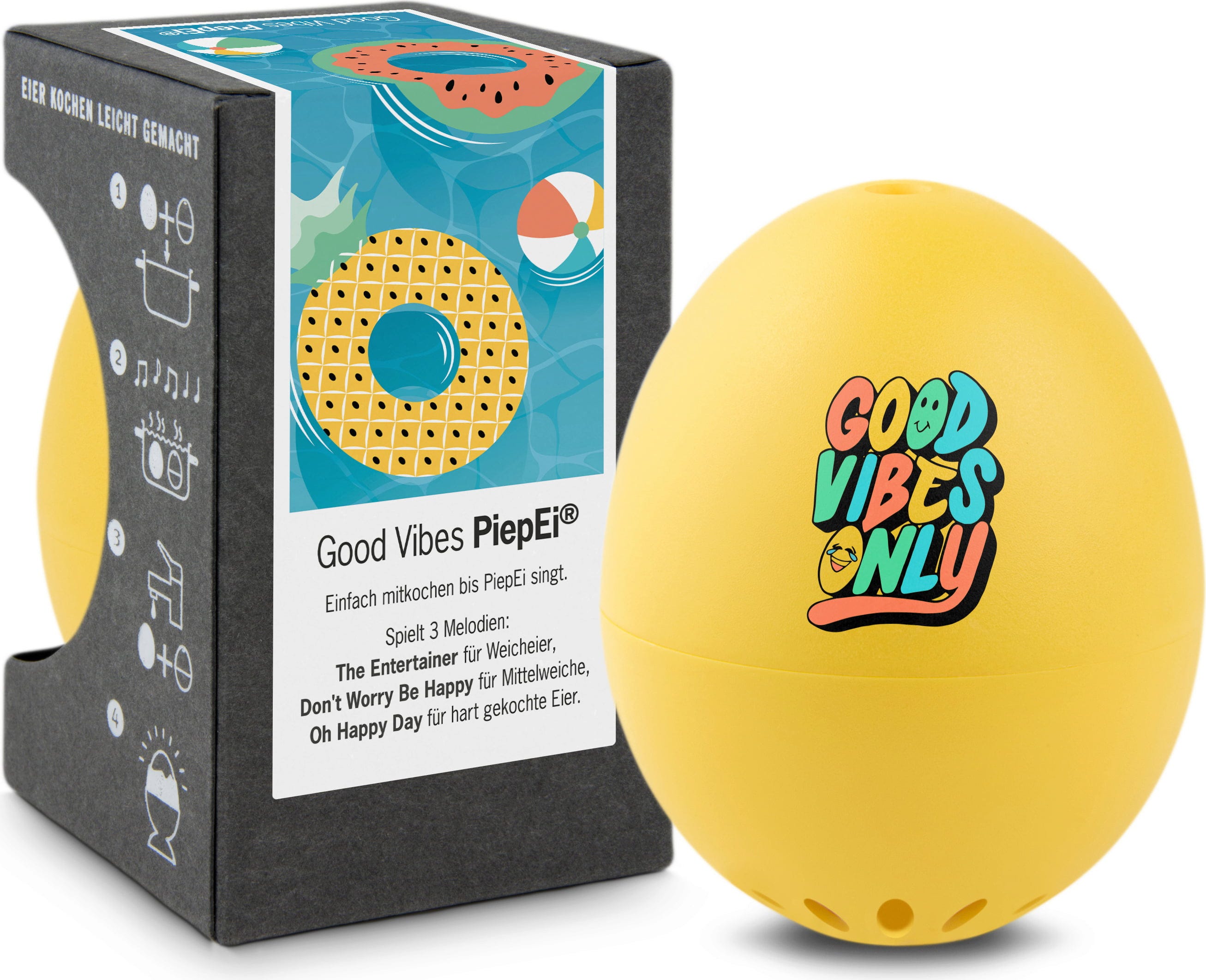 Egyszerűen tárolja a Good-Vibes-Only PiepEi eszközt a tojásokkal együtt, főzze őket közösen, és várjon, amíg a kívánt keménységi fokhoz tartozó dallam megszólal. Függetlenül attól, hogy milyen vízhőmérséklettel kezd, mekkora a tojás mérete, vagy milyen tengerszint feletti magasságon főz.