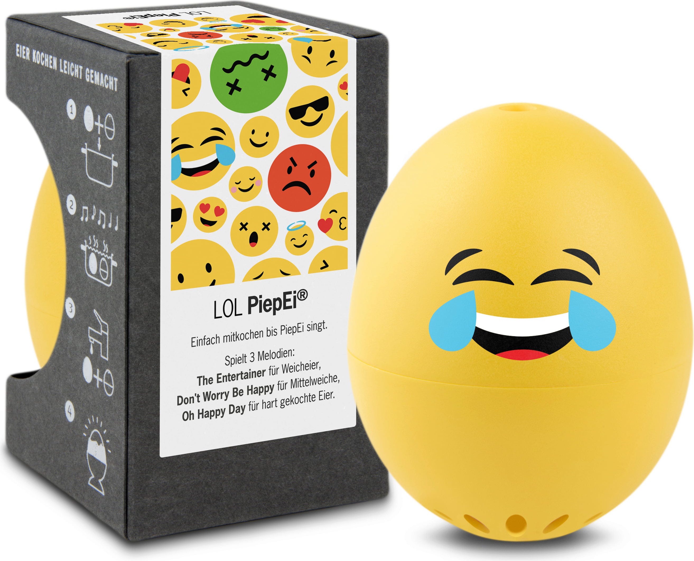 Egyszerűen tárolja a LOL PiepEi eszközt a tojásokkal együtt, főzze őket közösen, és várjon, amíg a kívánt keménységi fokhoz tartozó dallam megszólal. Függetlenül attól, hogy milyen vízhőmérséklettel kezd, mekkora a tojás mérete, vagy milyen tengerszint feletti magasságon főz.
