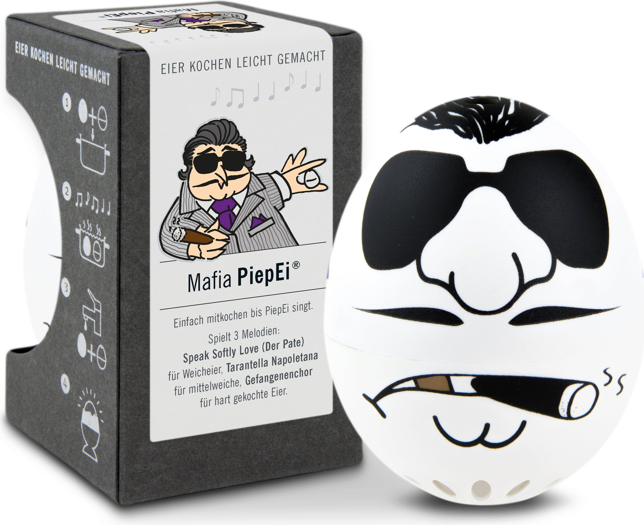 Egyszerűen tárolja a Mafia PiepEi eszközt a tojásokkal együtt, főzze őket közösen, és várjon, amíg a kívánt keménységi fokhoz tartozó dallam megszólal. Függetlenül attól, hogy milyen vízhőmérséklettel kezd, mekkora a tojás mérete, vagy milyen tengerszint feletti magasságon főz.