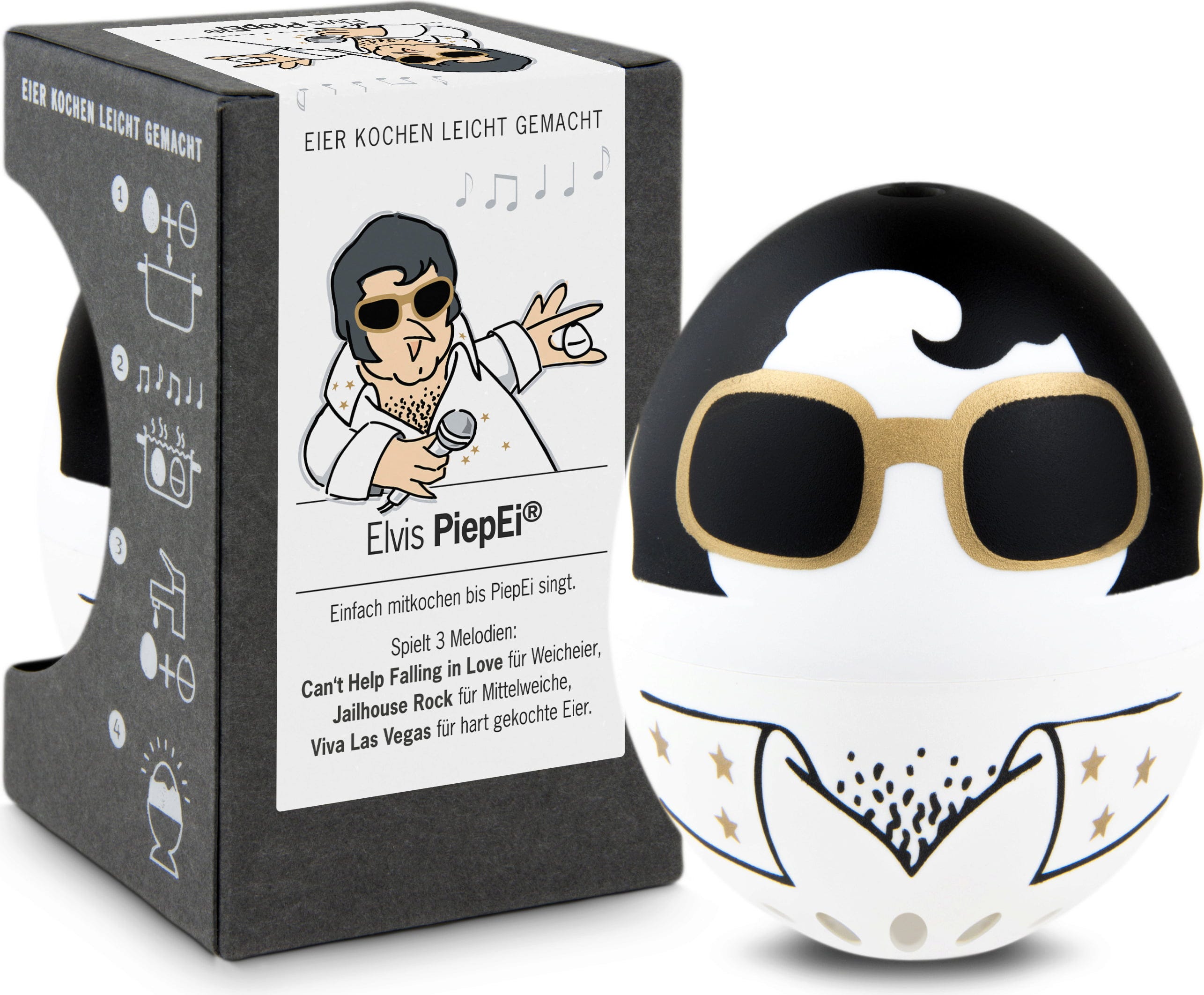 Egyszerűen tárolja a Elvis PiepEi eszközt a tojásokkal együtt, főzze őket közösen, és várjon, amíg a kívánt keménységi fokhoz tartozó dallam megszólal. Függetlenül attól, hogy milyen vízhőmérséklettel kezd, mekkora a tojás mérete, vagy milyen tengerszint feletti magasságon főz.