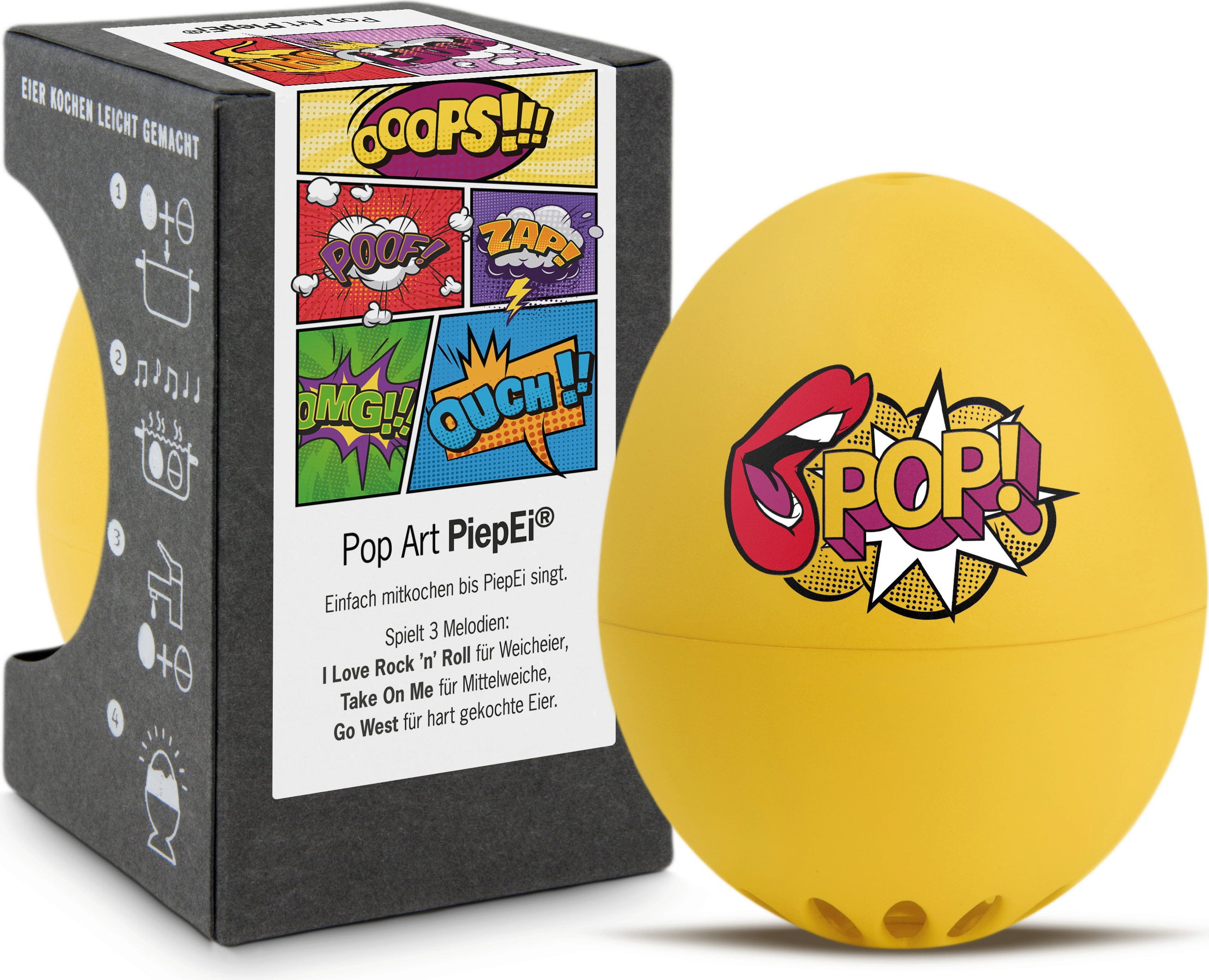 Egyszerűen tárolja a Pop Art PiepEi eszközt a tojásokkal együtt, főzze őket közösen, és várjon, amíg a kívánt keménységi fokhoz tartozó dallam megszólal. Függetlenül attól, hogy milyen vízhőmérséklettel kezd, mekkora a tojás mérete, vagy milyen tengerszint feletti magasságon főz.