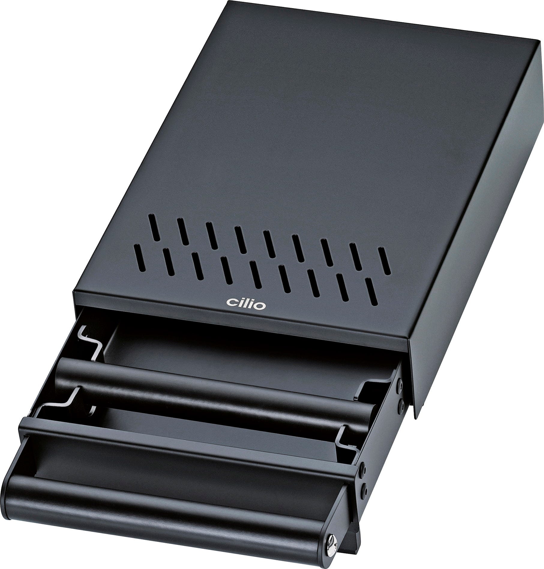 Tökéletesítse otthoni barista felszerelését a cilio BARISTA zaccfiók segítségével. Ez az ideális megoldás a kávézacc helytakarékos és stílusos tárolására. Stabil felépítésének és csúszásmentes lábainak köszönhetően egyúttal tökéletes alátétként is szolgál egy kis karos kávéfőzőgép vagy elektromos kávédaráló számára. A levehető, gumírozott leütőrúd hatékonyan tompítja a kar ütéseit. Ez nemcsak a füleket, hanem a felszerelés anyagát is kíméli.
