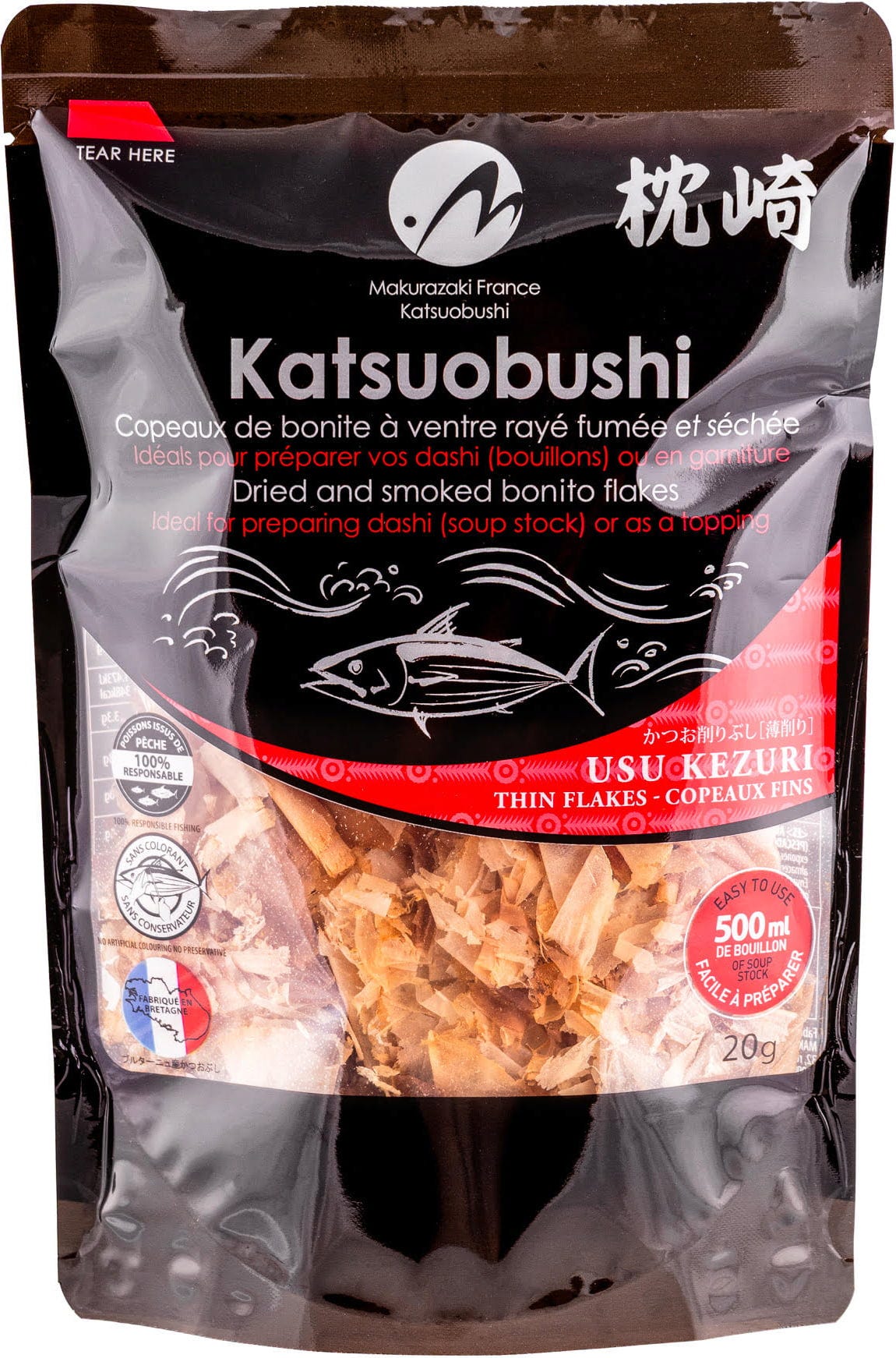 Ezek a vékony Katsuobushi pelyhek hagyományos eljárással készülnek Franciaországban, és umamiban gazdagok. Egyaránt alkalmasak klasszikus alaplevekhez, valamint feltétként Takoyaki, Okonomiyaki és sok más étel tetejére.