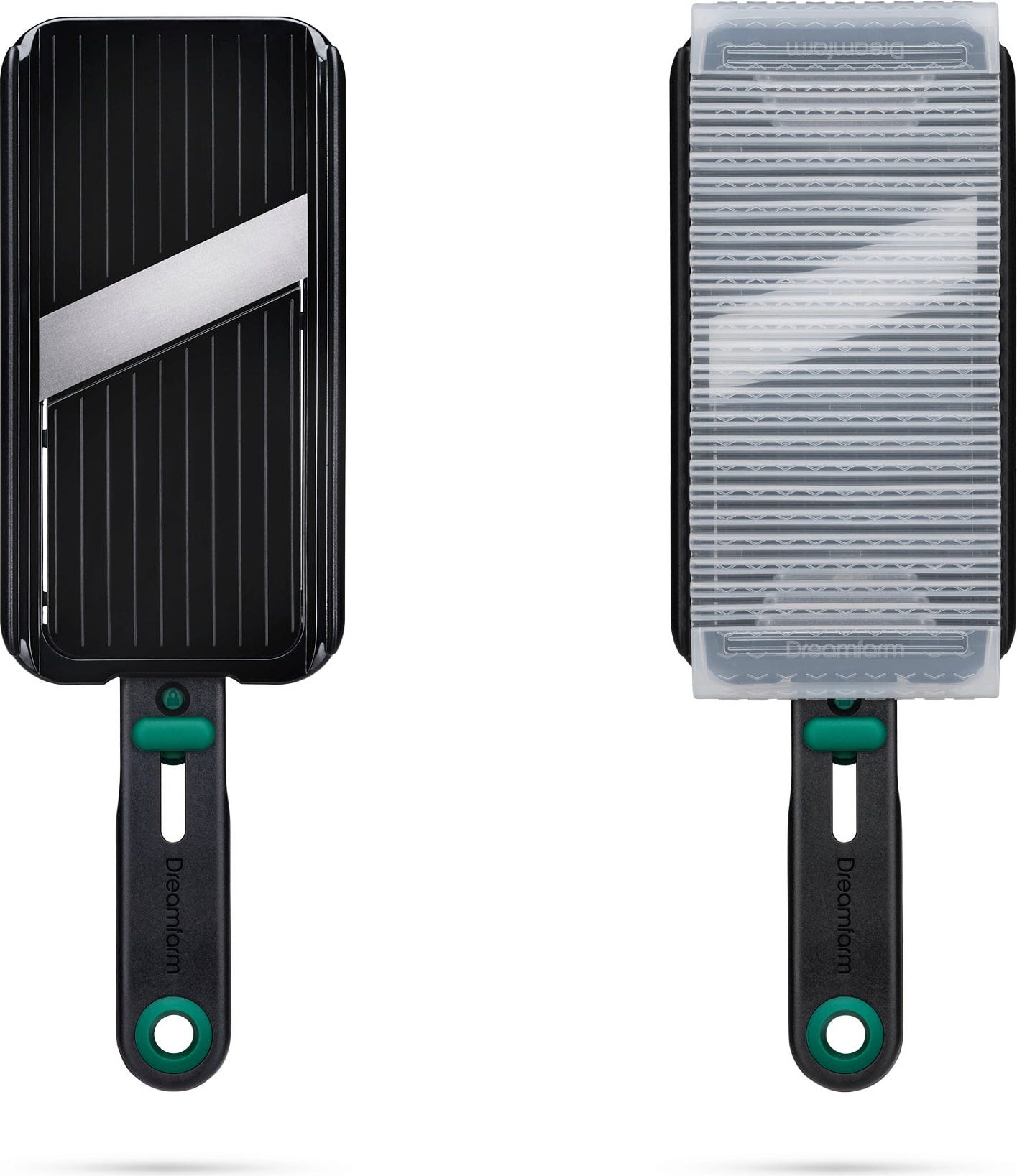 A saláták, burgonyák és friss zöldségek mostantól gyorsabban és biztonságosabban vághatók tökéletes szeletekre, mint valaha! A Dreamfarm Nocutu mandolin szelető borotvaéles rozsdamentes acél pengével rendelkezik, amelyet igény szerint 1 és 3 mm közötti vastagságra állíthat be. Annak érdekében, hogy munka közben ne kelljen aggódnia az ujjai miatt, a csomag részét képezi egy nagy méretű, rugalmas ujjvédő is, amely megbízhatóan óvja Önt a sérülésektől.