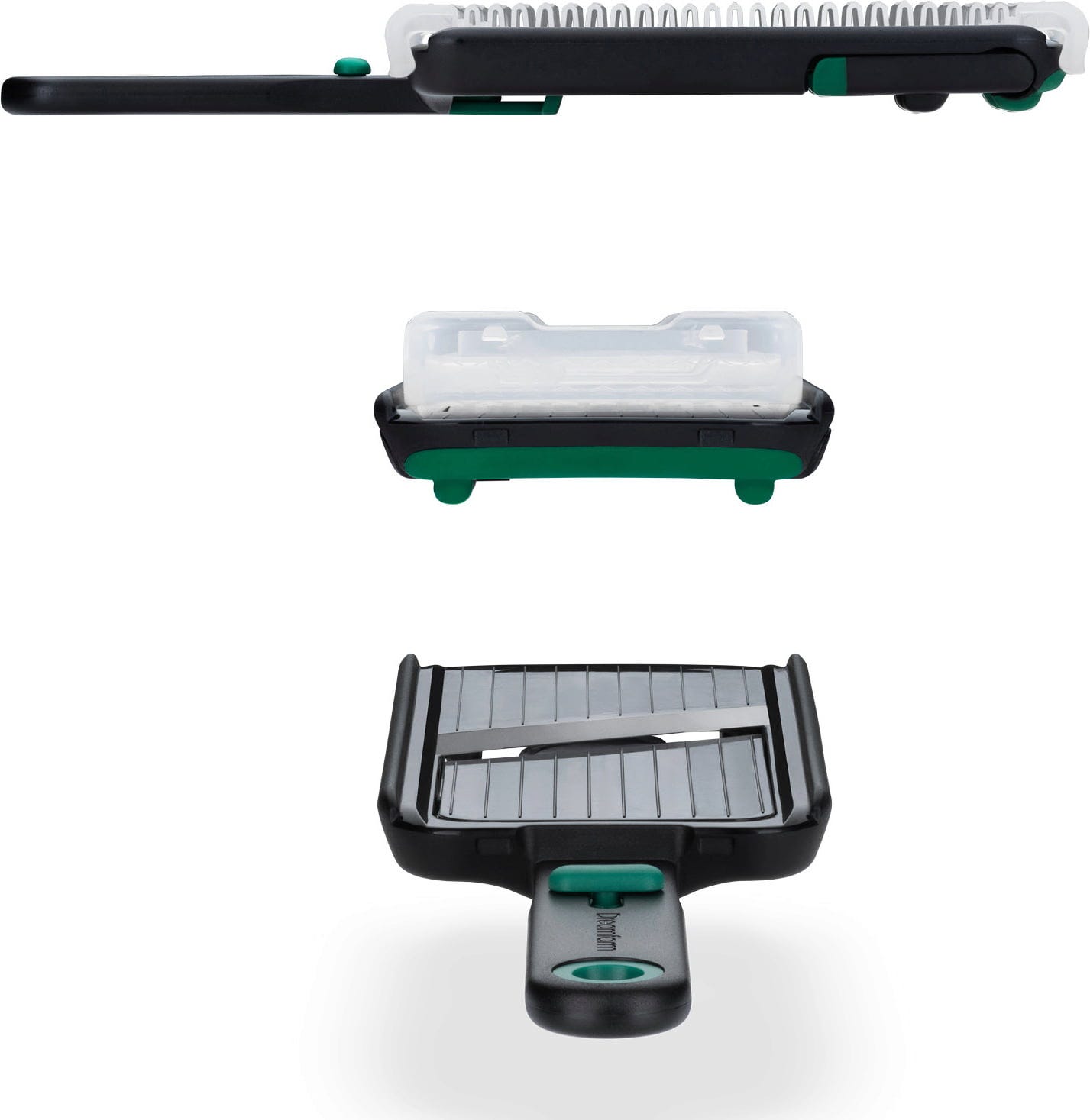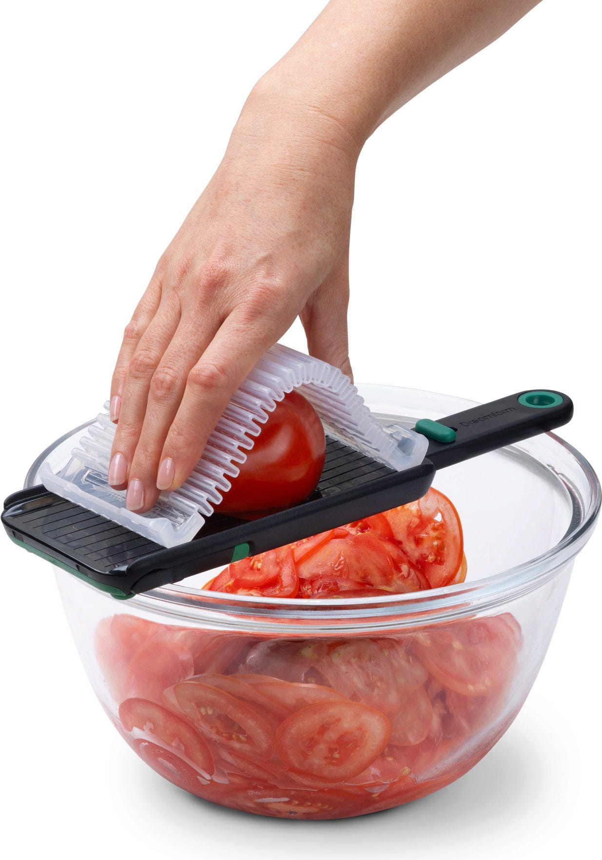 A penge használat után szorosan lezárható, így a gyalut abszolút biztonságosan és helytakarékosan tárolhatja bármelyik fiókban. Legyen szó hajszálvékony uborkaszeletekről vagy vastagabb burgonyakorongokról, ez a rozsdamentes acélból és kiváló minőségű műanyagból készült robusztus eszköz gyerekjátékká teszi az ételek előkészítését.