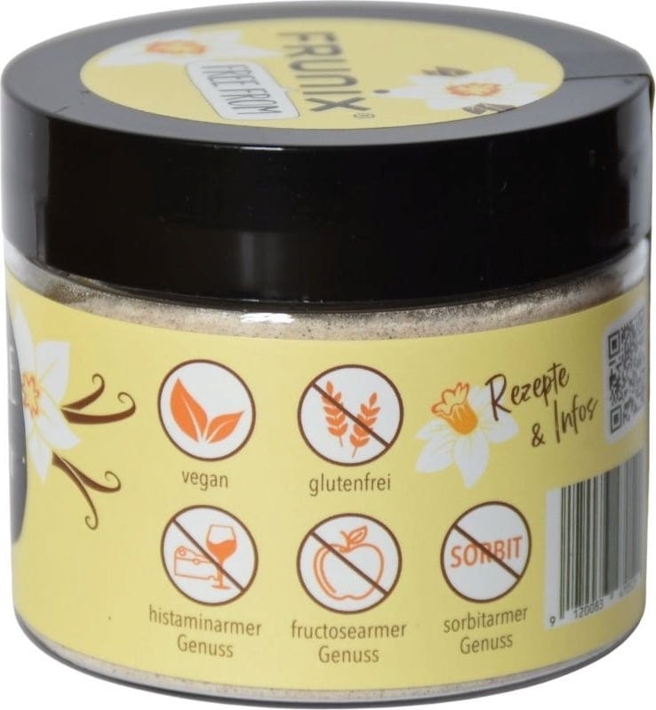 Vaníliás kifli, gyümölcssalátaöntet, puding, kakaó - A FRUNIX® által gyártott Vaníliás cukor 6% valódi bourbon vaníliával mennyei ízt kölcsönöz a sütemények, az ételek és az italok számára! Az intenzív aromának köszönhetően a termék különösen gazdaságos: Egy teáskanál termék egy teljes csomag hagyományos vaníliás cukornak felel meg - érzéssel adagolandó!