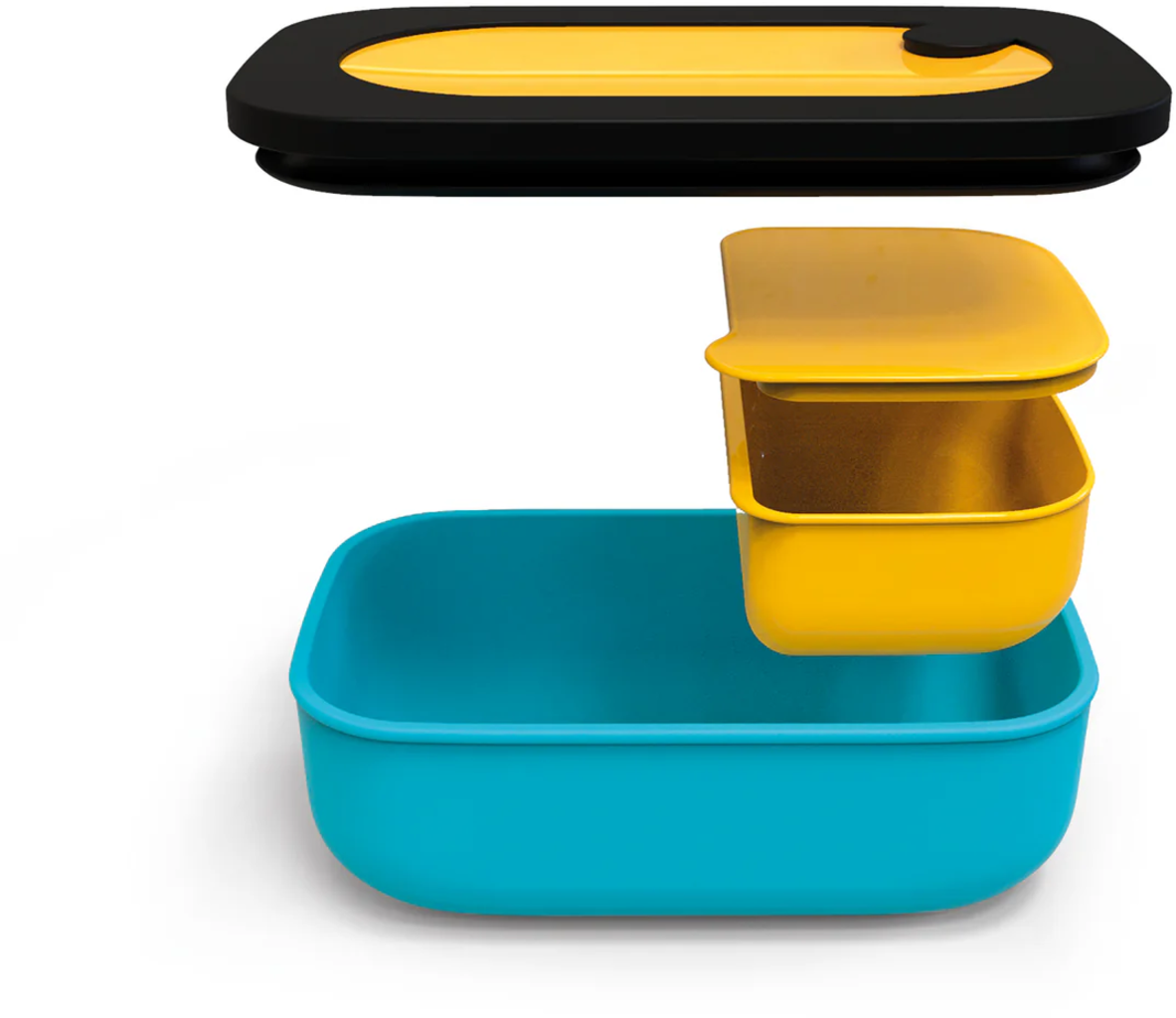 Ez az uzsonnásdoboz szett két téglalap alakú, egymásra rakható dobozból, egy légmentesen záródó fedélből és egy evőeszközből áll. Különböző ételek szállítására szolgál, keveredés vagy ízszennyeződés nélkül. A doboz hűtőszekrényben vagy fagyasztóban is használható, mosogatógépben mosható, és a szellőzőnyílással ellátott fedélnek köszönhetően mikrohullámú sütőben is használható.