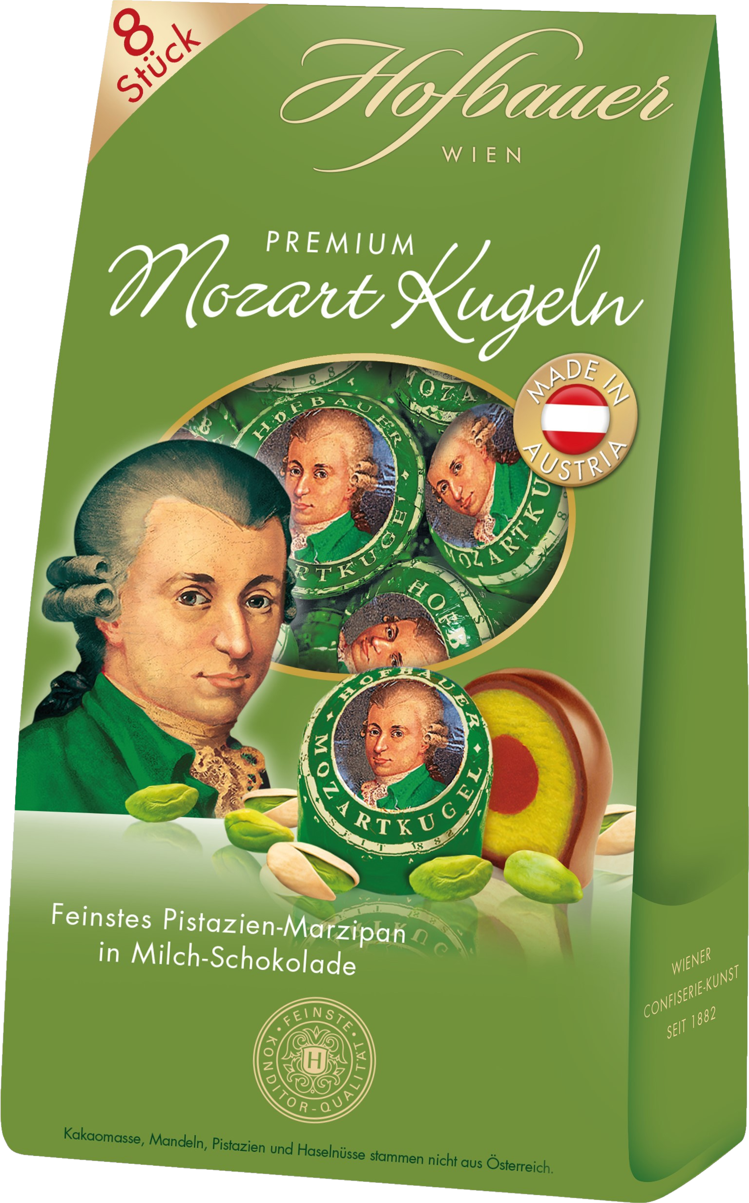 A Hofbauer Mozartkugeln Pisztácia a finom kézművességet a legfinomabb kényeztetéssel kombinálja. A finoman olvadó tejcsokoládé egy aromás pisztácia-marcipán és mogyorós nugát réteget burkol be. A diós mélység és a finom édesség harmonikus kompozíciója minden golyót az osztrák cukrászati hagyományok kis műalkotásává tesz. Tökéletes nassolnivalóként, valamint ajándékozásra és álmodozásra.