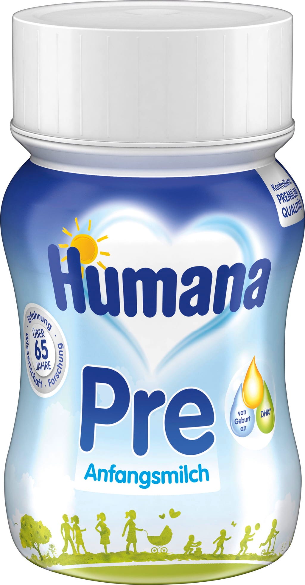 A Humana Pre anyatej-helyettesítő tápszer születéstől fogva adható, akár az anyatej kiegészítéseként, akár önmagában is. Ez a tápszer DHA-t és szénhidrátként csak laktózt tartalmaz. Fogyasztásra kész formulájának és praktikus flakonnak köszönhetően ideális útközbeni etetéshez is, mivel csak át kell tölteni és felmelegíteni.
