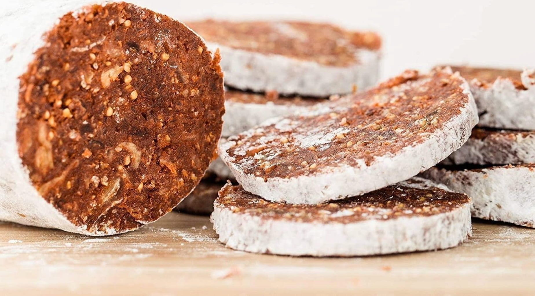A Füge szalámi - füstölt paprikával görög fügéből (kymi) készült vegán, szójamentes húsalternatíva. A füstölt paprika, a fahéj és a bors további finom ízeket kölcsönöz. Élvezze az aszalt gyümölcsös szalámit snackként, salátában vagy sajttal kombinálva.