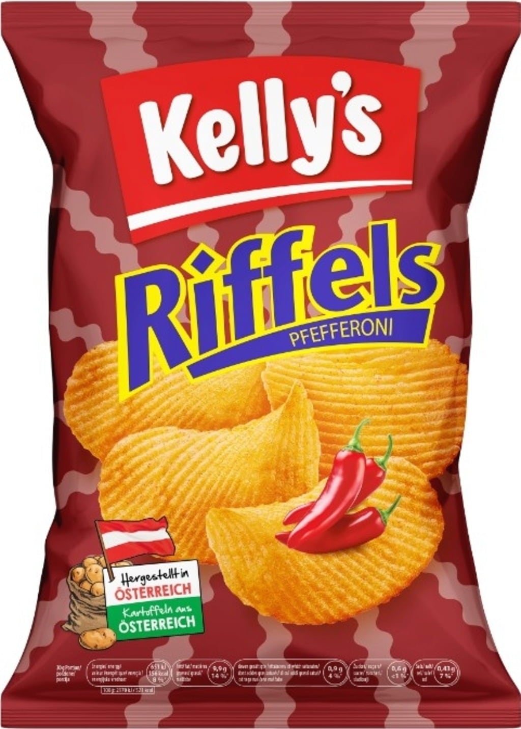 A Kelly's pepperoni ízesításű bordázott burgonya chips osztrák burgonyából készül. A receptúra 100%-ban vegán, ízfokozót nem tartalmaz. Különösen ropogós, és garantáltan a következő buli fénypontja lesz.