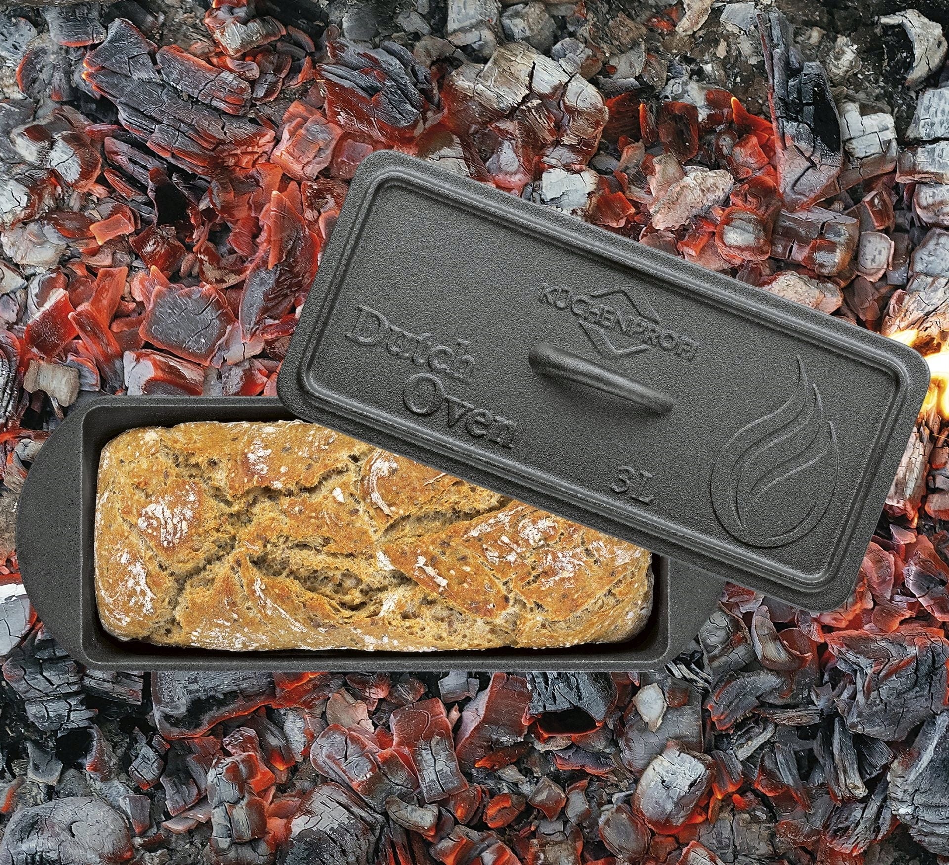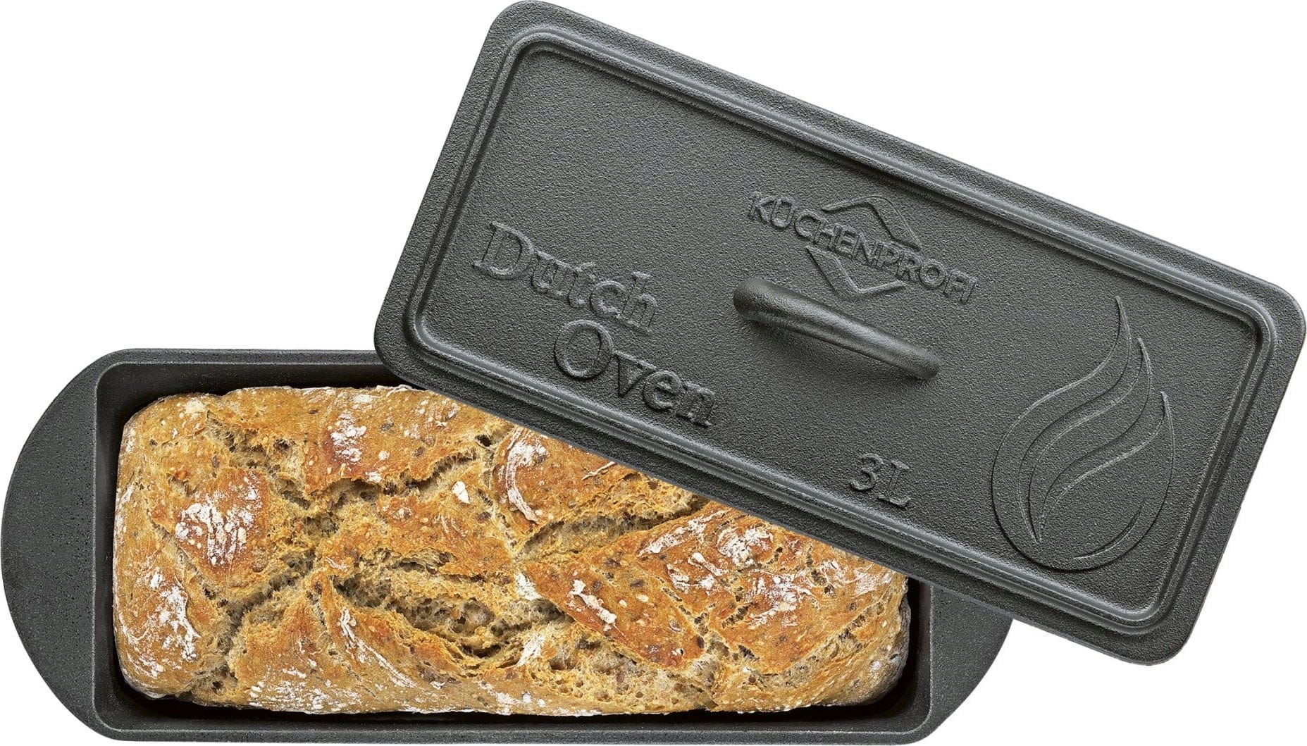 Ez a robusztus öntöttvasból készült szögletes sütőforma fedéllel nemcsak kenyerekhez és süteményekhez kiváló, hanem felfújtakhoz és sültekhez is, akár közvetlenül a grillen elkészítve.