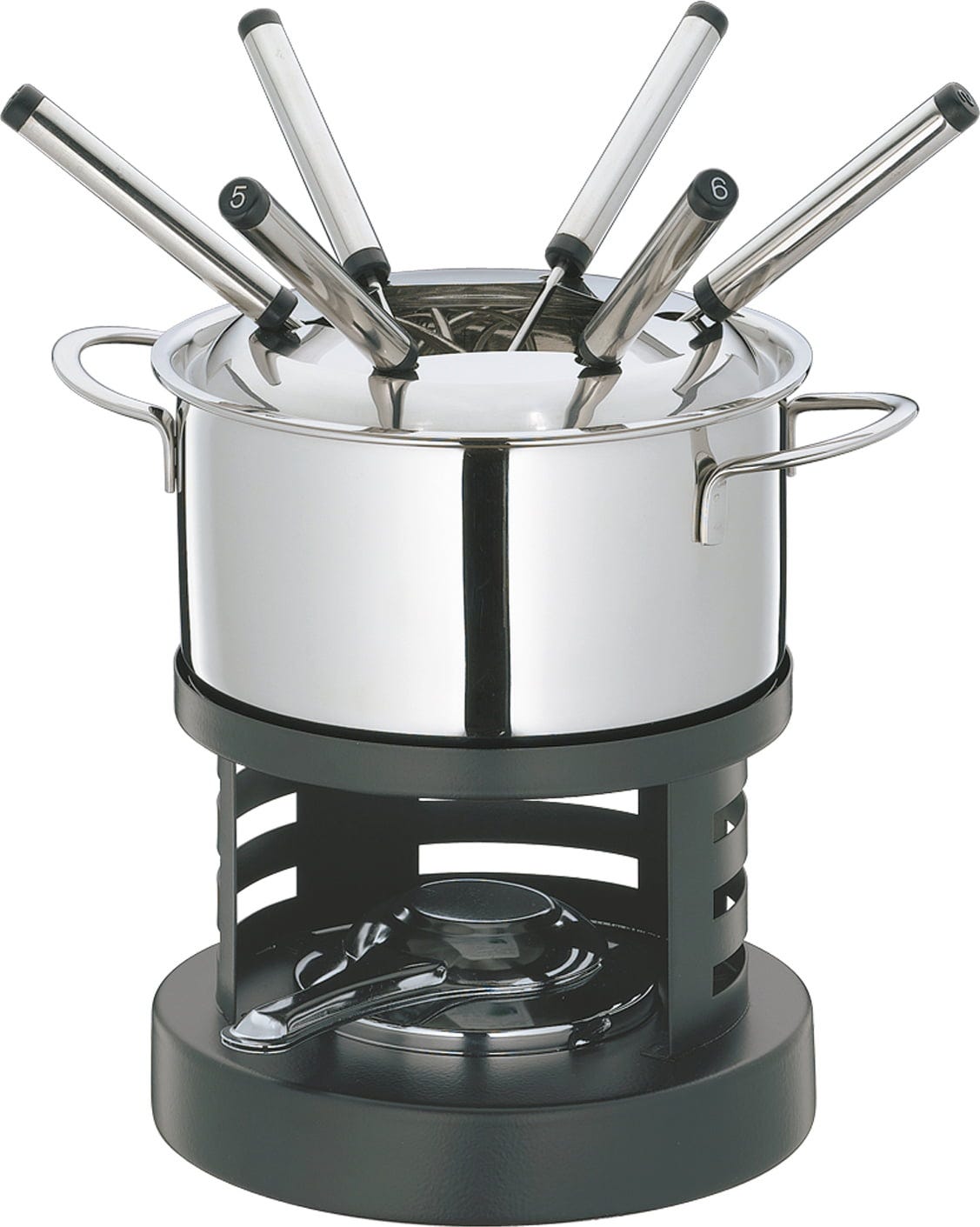A csomag tartalma: Fondü edény fröccsenésvédővel, Rechaud, biztonsági égőpaszta, 6 fondüvilla