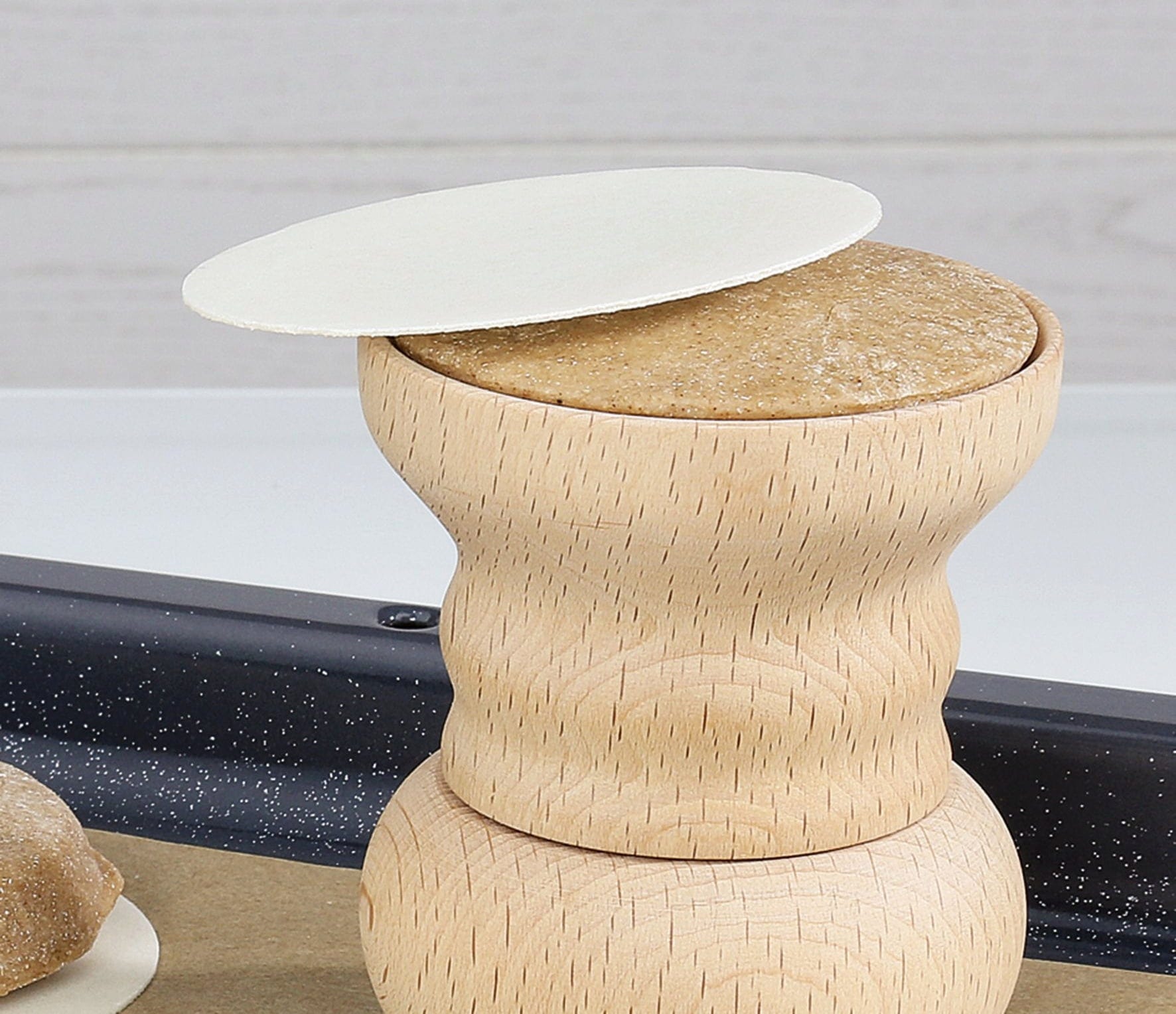- Könnyen használható: töltse be a tésztát a formába, simítsa el, majd óvatosan nyomja rá az ostyára, és forgassa el a formát az óramutató járásával megegyező irányba. Ezután csúsztassa a mézeskalácsot közvetlenül a tepsire.
