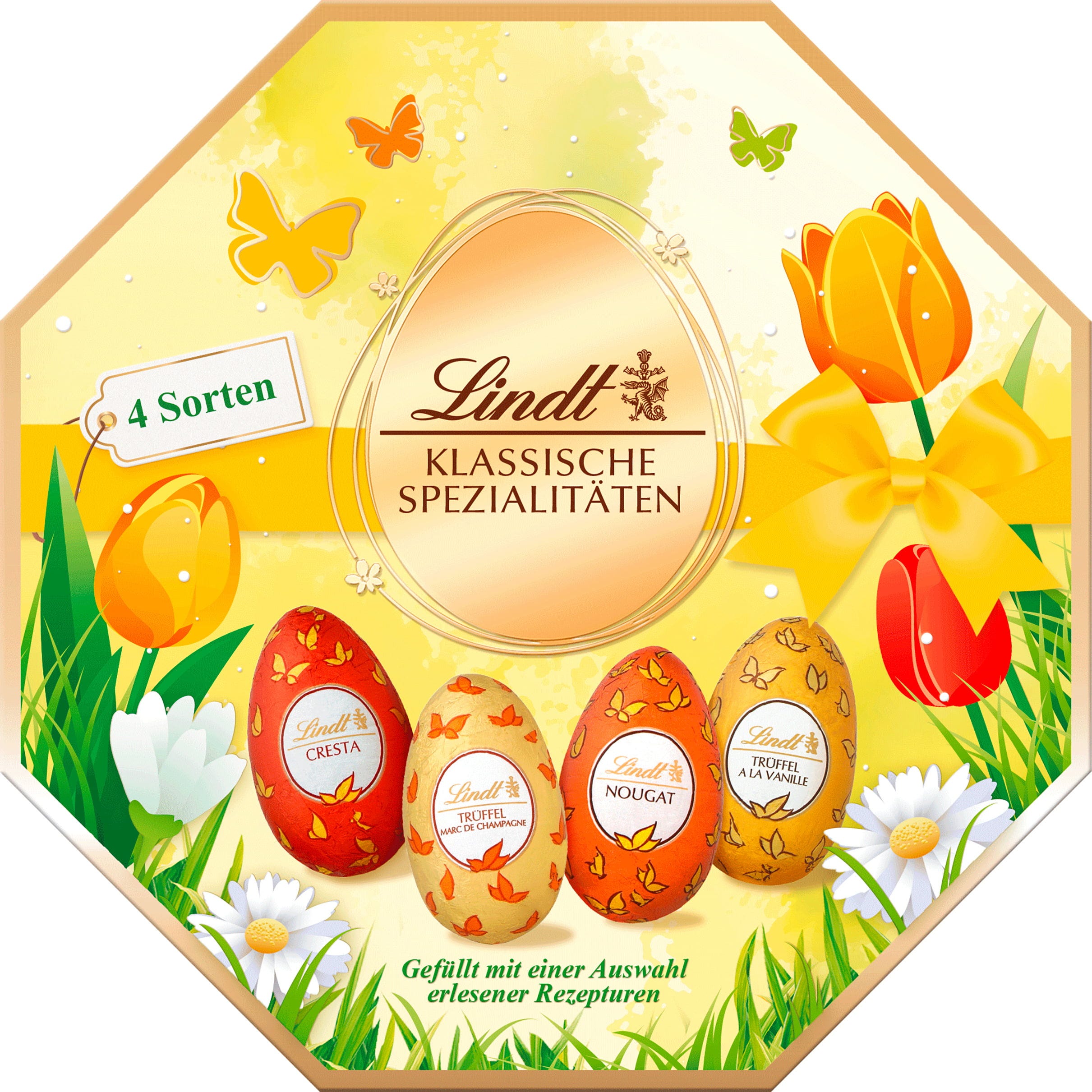 Ajándékozza meg szeretteit, vagy önmagát, ezzel a pompás csokoládétojás-kínálattal, mely 4 fajtát tartalmaz: