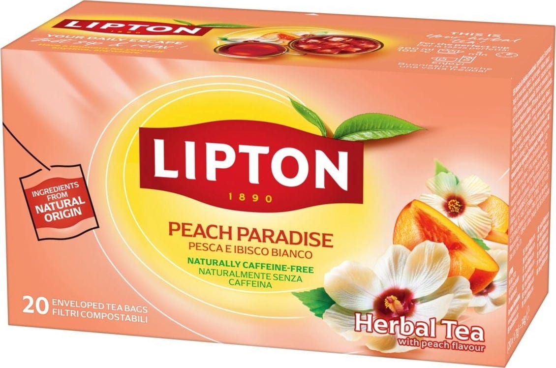 A Lipton Peach Paradise tea a napérlelte őszibarack és a finom fehér hibiszkusz tökéletes keverékét kínálja. Mivel ez a kompozíció természetéből adódóan nem tartalmaz koffeint, gyümölcsös pillanatait a nap bármely szakában teljes mértékben kiélvezheti – függetlenül attól, hogy forrón készíti el, vagy hűsítő jeges teaként fogyasztja. Az egyenként csomagolt, komposztálható teafilterek megőrzik a teljes, természetes aromát.
