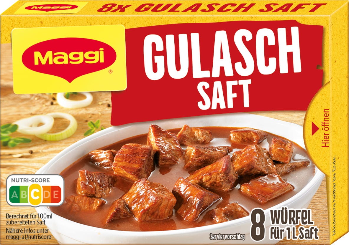 A Maggi Pörköltszaftkocka elengedhetetlen része az osztrák konyhának. Intenzív, tipikus ízével pillanatok alatt finomíthatja ételeit, miközben csodálatosan krémes állagot biztosít. Legyen szó klasszikus pörköltről, tokányról vagy sültekről – az íz megbízhatóan és teljes mértékben érvényesül. Gombócokhoz, tésztafélékhez, rizshez vagy kolbászhoz készült pörköltszafthoz is alkalmas.