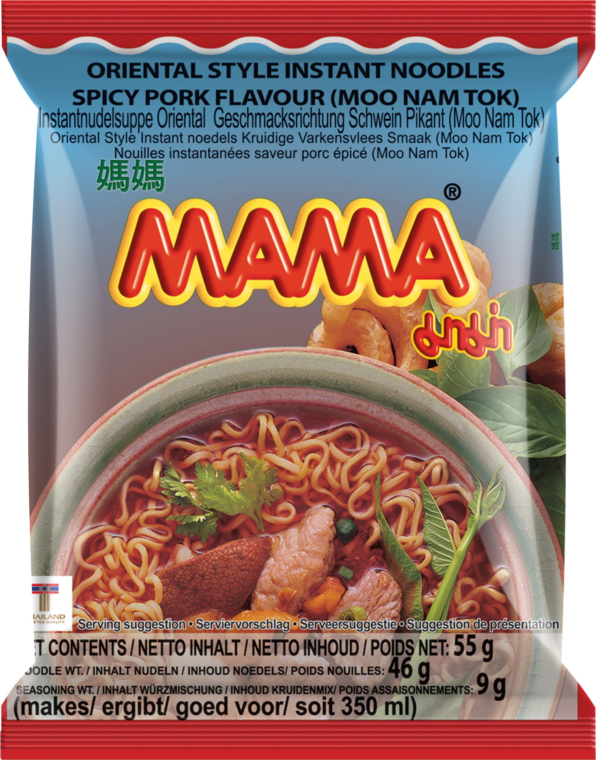 A MAMA Moo Nam Tok instant tészta elviszi otthonába a grillezett sertéshússal készült Nam Tok saláta autentikus thaiföldi ízélményét. A tartalmas alaplében a fűszeres chili jegyek és az aromás szójaszósz találkozása valódi ízrobbanást eredményez. A finom tészta mindössze néhány perc alatt elkészül – ideális választás mindazoknak, akik valami különlegesre vágynak ázsiai beütéssel.