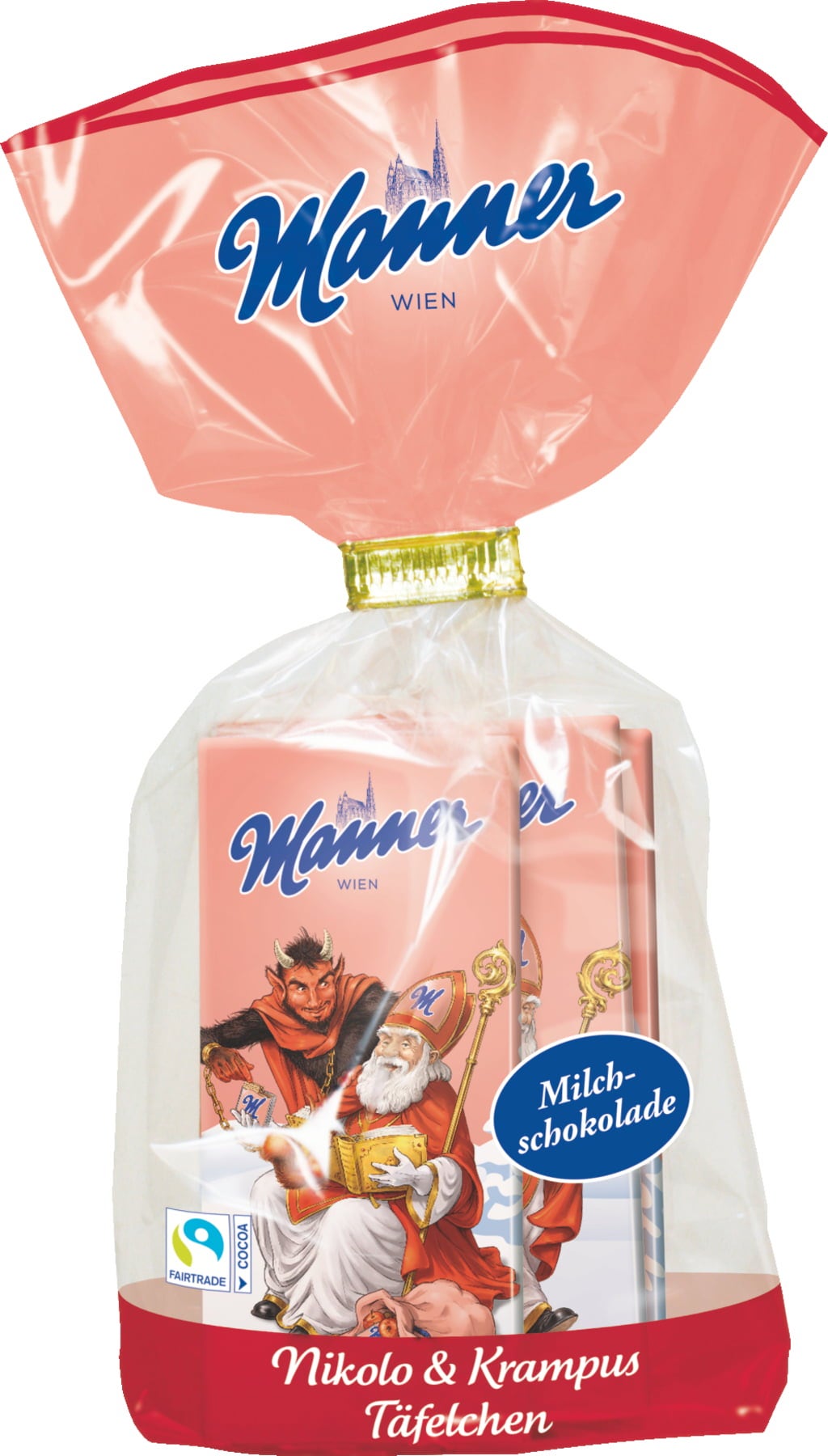 Az öt kis Manner tejcsokoládé mini tábla nosztalgikus Mikulás és Krampusz motívumokkal ideális a Mikulás csomagba: a lágy tejcsokoládénak minden kis angyal és csibész örülni fog!