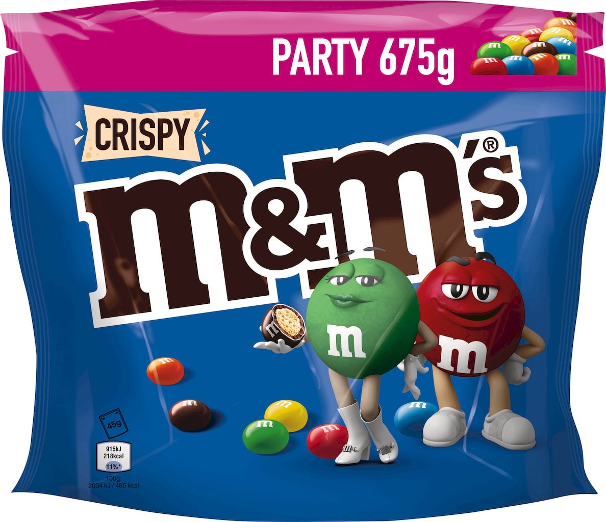 Az M&M's Crispy mindig tökéletes nassolnivaló! Belül ropogós rizsszem található, amelyet finom tejcsokoládé borít és színes cukorbevonattal ellátott.