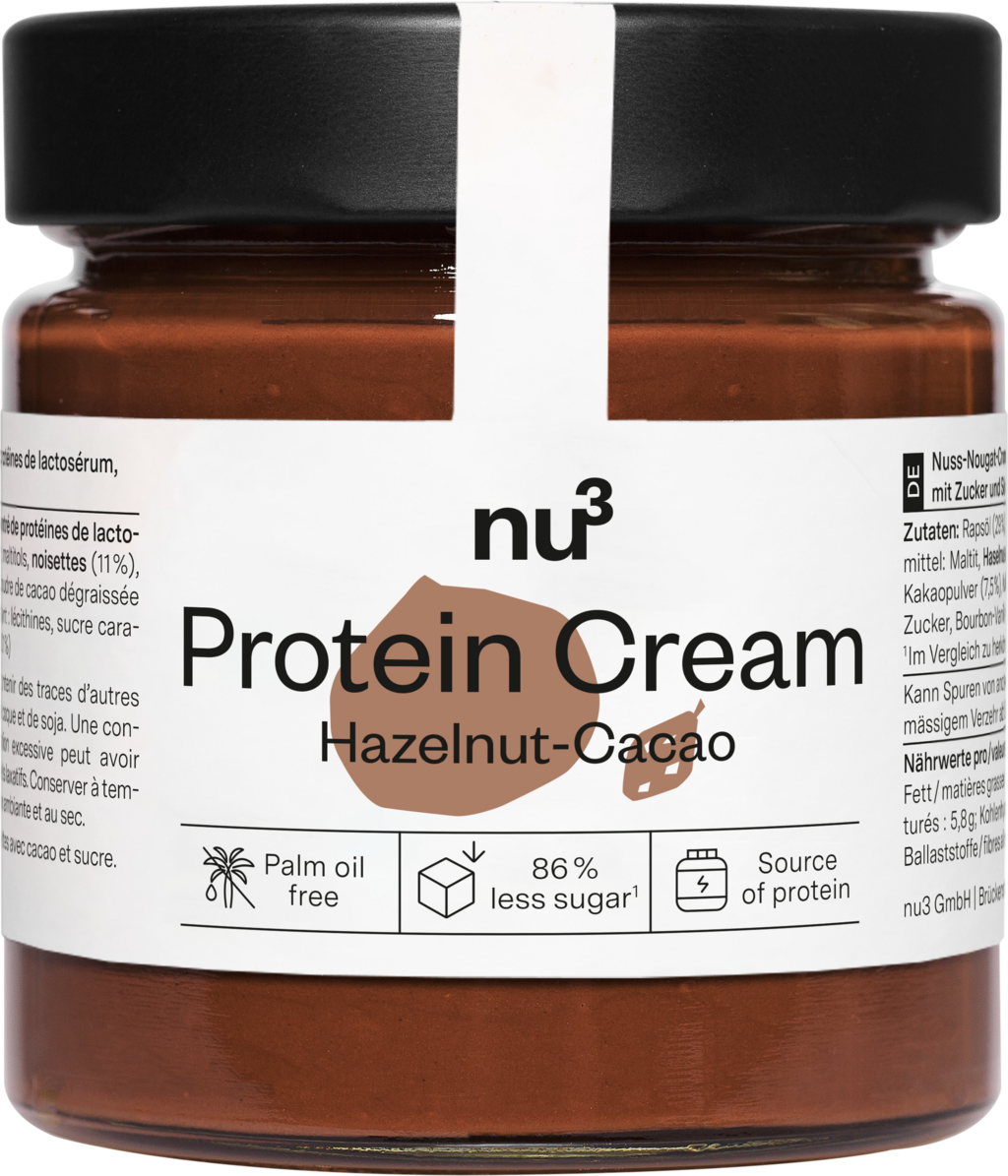 A nu3 Protein krém kiváló minőségű fehérjeforrás, és jó alternatívát kínál. Fajtától függően több mint 20% tejsavófehérjét és akár 99%-kal kevesebb cukrot tartalmaz, mint a hagyományos édes kenhető krémek. A tartósítószer-, pálmaolaj- és szukralózmentes fajták testes ízükkel és természetes összetevőikkel lenyűgöznek. A kenhető krém sokféleképpen felhasználható, remek zsemlékhez, palacsintához, zabkássához, sütéshez vagy önmagában is.