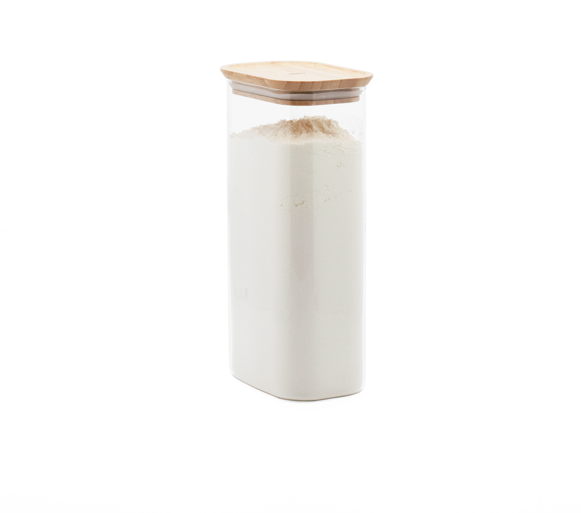 Ez a tárolóedény robusztus boroszilikát üvegből készült, és stílusos, természetes bambuszból előállított fedéllel rendelkezik. A bambusz nemcsak jól néz ki, hanem gyorsabban is nő, mint a fa, és sokkal kevesebb vizet igényel.