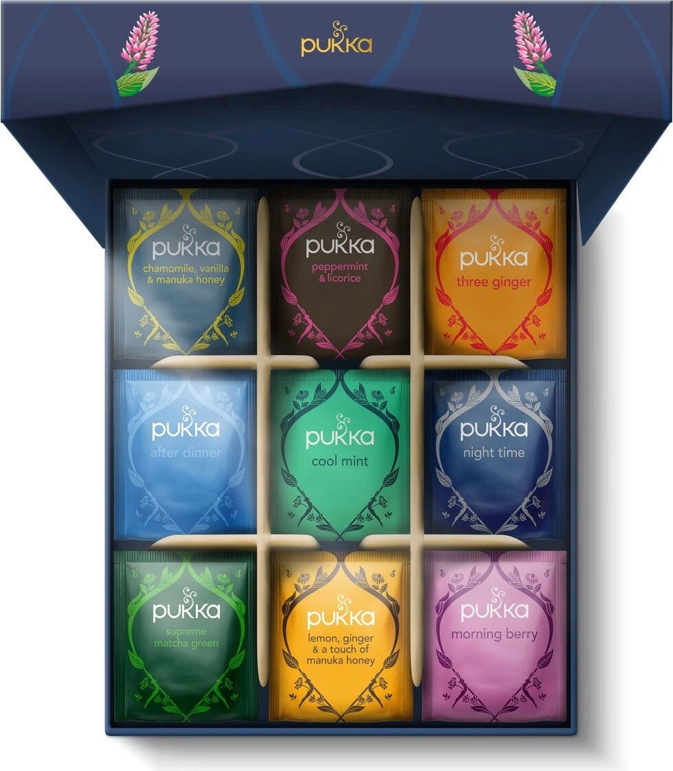A nagy kedvenc teásdoboz 9 különböző teafajtát tartalmaz, amelyek változatos élvezetről gondoskodnak. A teavariációkat a PUKKA szakértői gondosan, az ayurvédikus tanítások szerint állították össze, és kiegyensúlyozott jegyeikkel kényeztetik Önt. A doboz csinos, virágos külsejével is lenyűgöz, amely mind a teák bemutatására, mind újrafelhasználásra alkalmas.