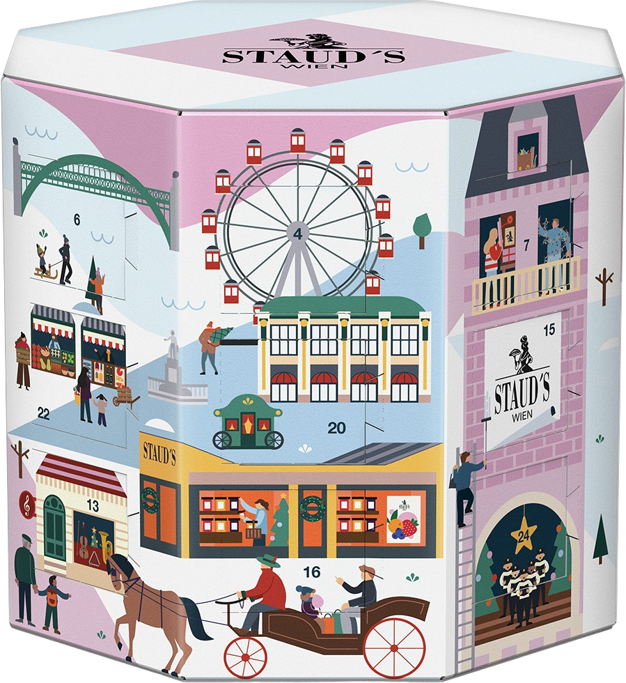 24 öröm és élvezet – hagyja, hogy Staud's adventi naptárja minden nap meglepje. Nem csak a bevált klasszikusok, hanem vadonatúj alkotások is felfedezésre várnak. A gyönyörű csomagolás Bécs legszebb helyeit mutatja be. A Staud's adventi naptára minden évben kiválasztott társadalmi projekteket támogat, köztük a Caritas, az Integrationshaus Wien, az Unser Stephansdom egyesület vagy a Save the Child Salzburg.