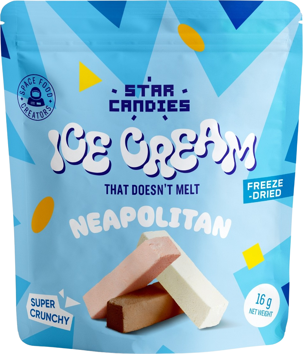 Fedezze fel a Supergarden STAR CANDIES liofilizált fagylaltot Neapolitan változatban! Ez a kivételes desszert egzotikus, csodálatosan ropogós, pehelykönnyű és nem olvad el – a teljes fagylaltélmény, fagyasztó nélkül!