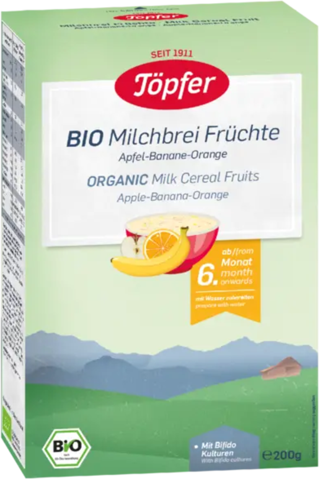 Töpfer Bio tejes kása - Gyümölcsök, alma, banán és narancs, 200 g