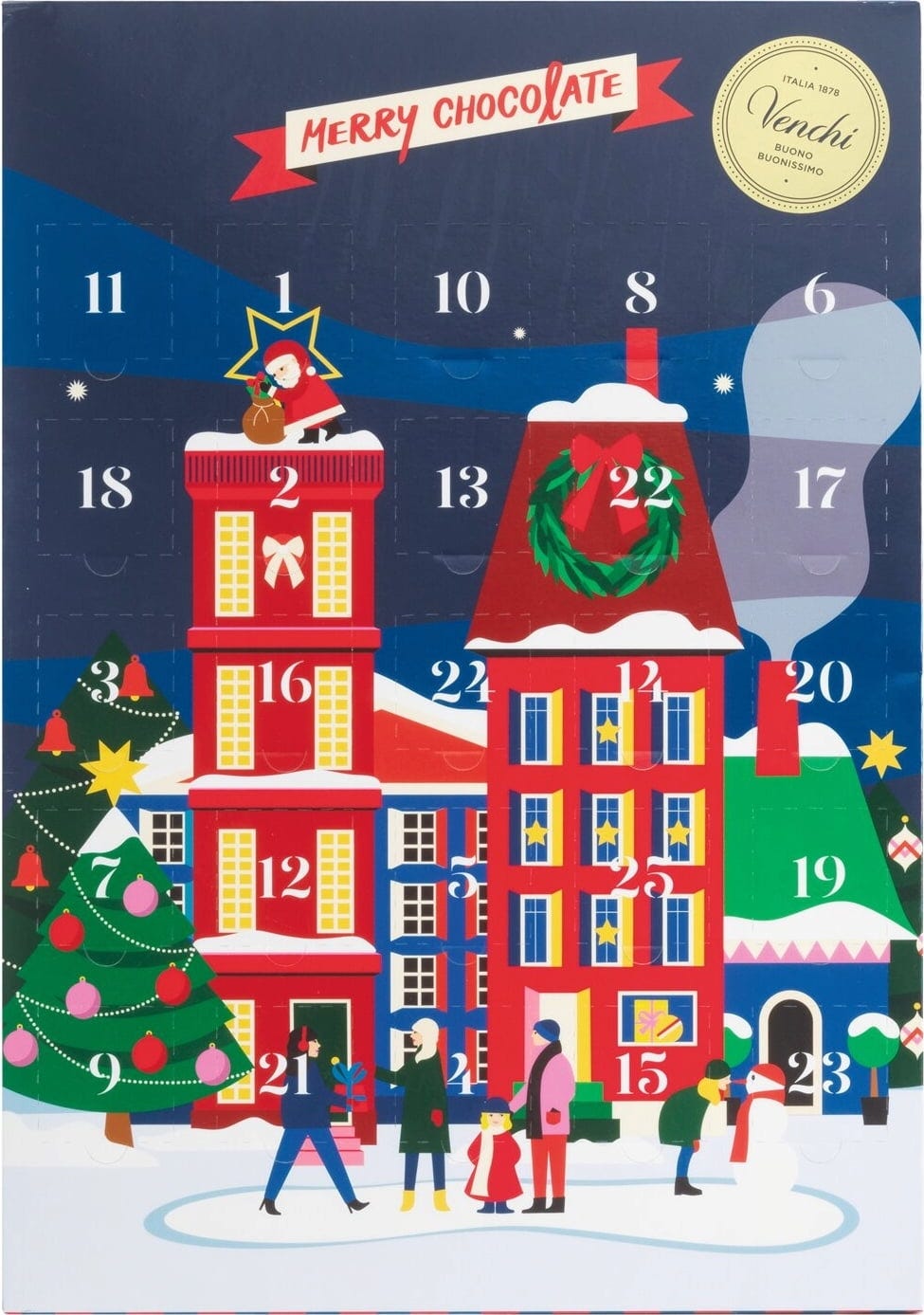 Olaszországban a karácsonyt hagyományosan december 25-én ünneplik, így az olasz Venchi csokoládégyár adventi naptárán is 25 ablakocska található.