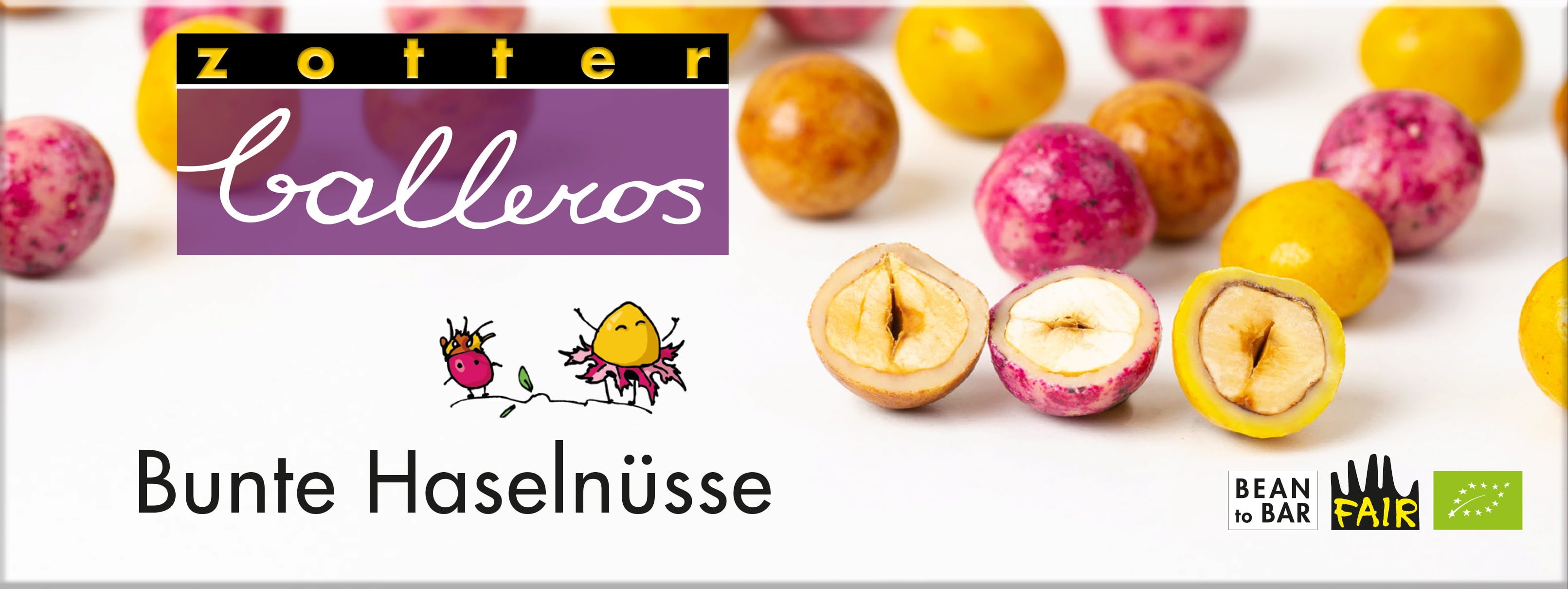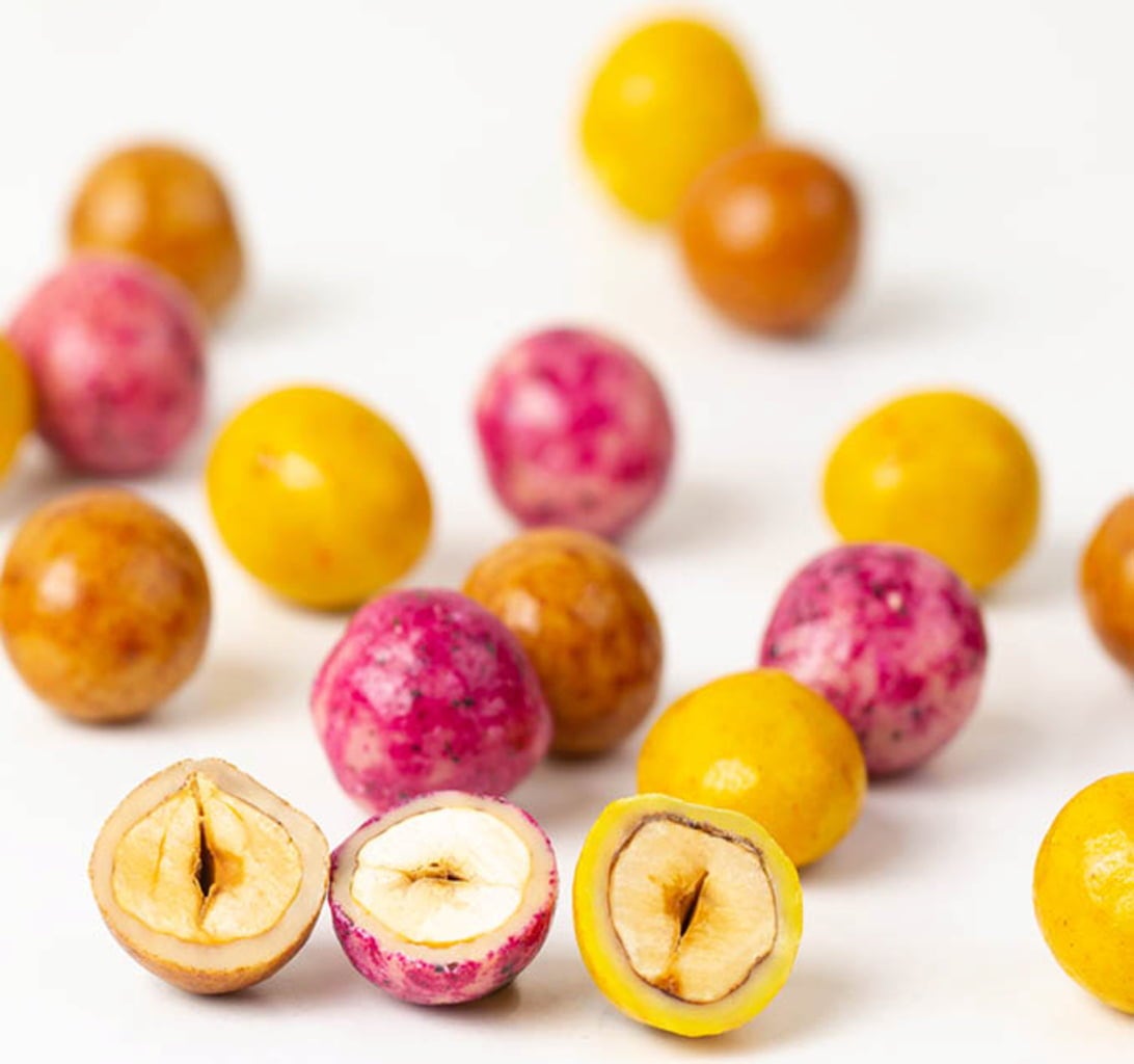 Ezek a színes mogyorók nem csak vidáman néznek ki, de az ízük is fantasztikus! Belsejükben fair trade, ropogós, pörkölt mogyoró található, finom fehér csokoládéval bevonva. Ami különleges bennük: három egyedülálló íz- és színvilág egyesül ebben a nassolnivalóban.