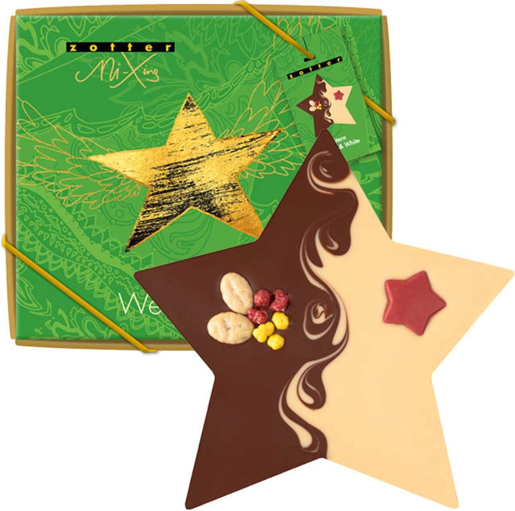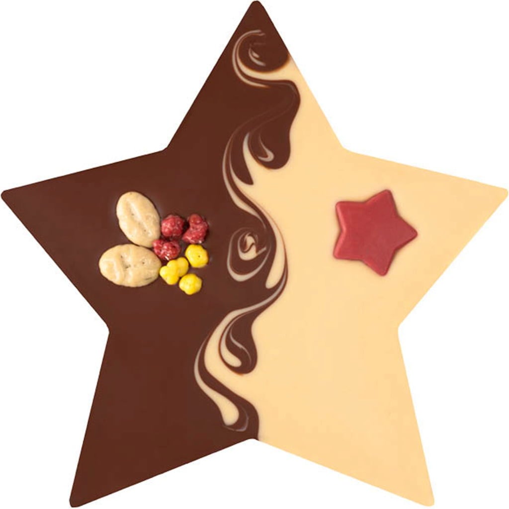 Ez a kombináció mindig nagy sikert arat: a fehér csokoládé találkozik az 50%-os kakaótartalmú tejcsokoládéval. És mivel mindig lehet jobb is, az édes csillagot mindenféle finom feltéttel díszítik. Nagyszerű ajándék a közelgő ünnepekre.