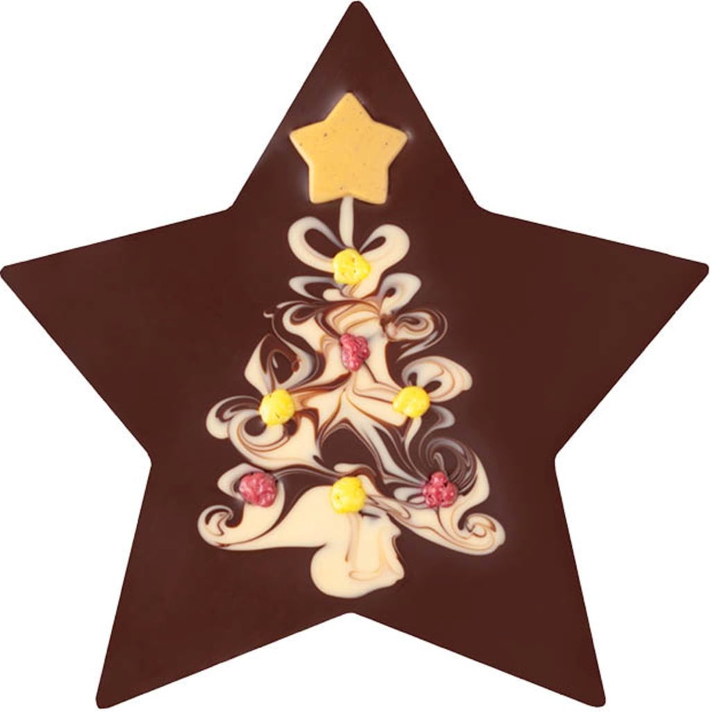 Étcsokoládé édes fehércsokoládéból készült karácsonyfával. Ropogós maracujás csokoládédarabok, pink málnás bevonatba forgatott kakaóbabtöret, valamint egy karamellás-vaníliás csillag teszik teljessé az ünnepi élményt.
