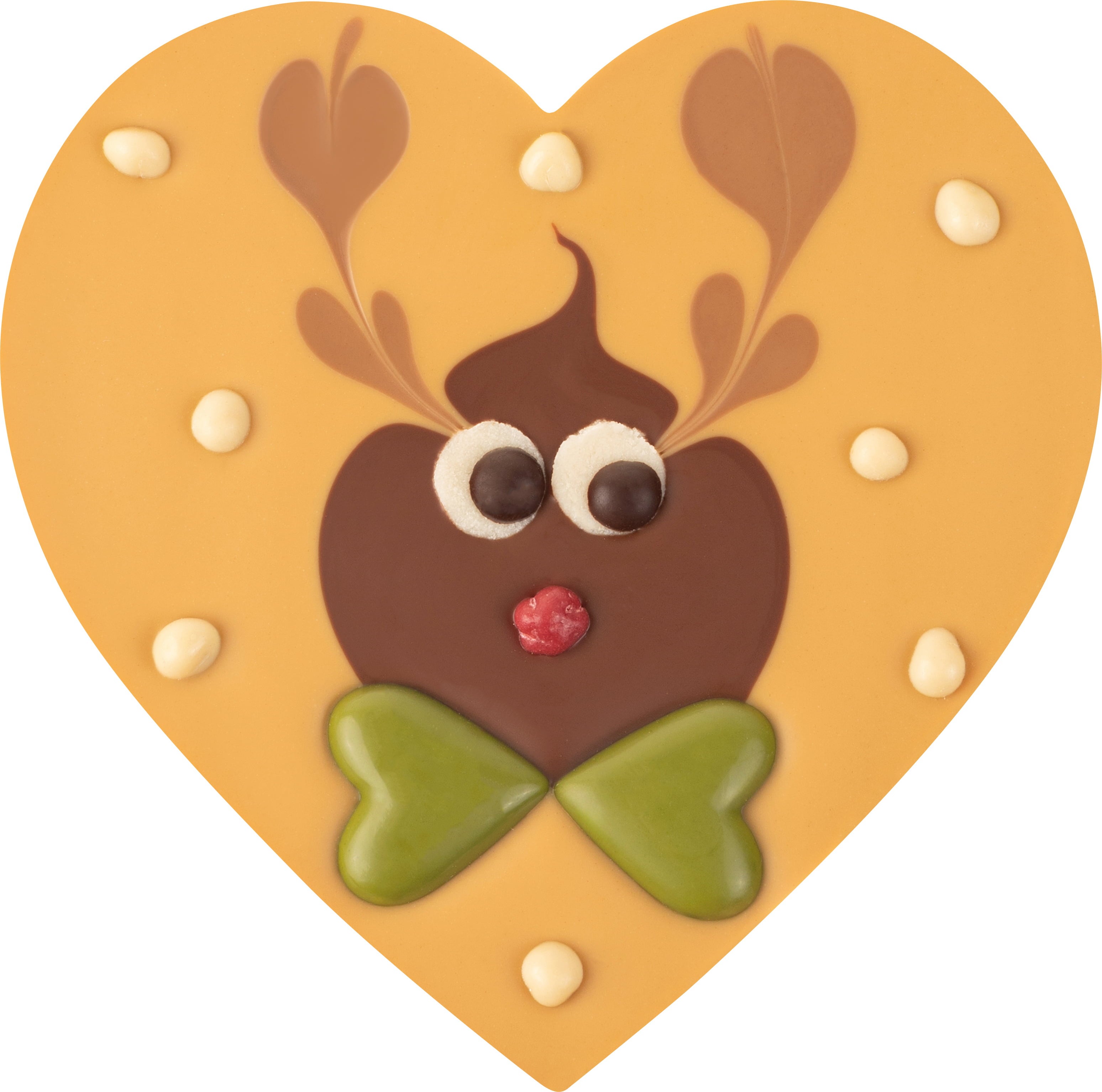 Ez az édes, karamellizált csokoládéból készült szív gyümölcsös málnakrémmel van töltve, míg a felszínét egy bájos rénszarvas motívum díszíti tejcsokoládéból és mandulás csokoládéból.Aranyos marcipánszemekkel, málnás orral, amelyben egy roppanós kakaóbab lapul, valamint zöld teás csokoládészívekből készült masnival.